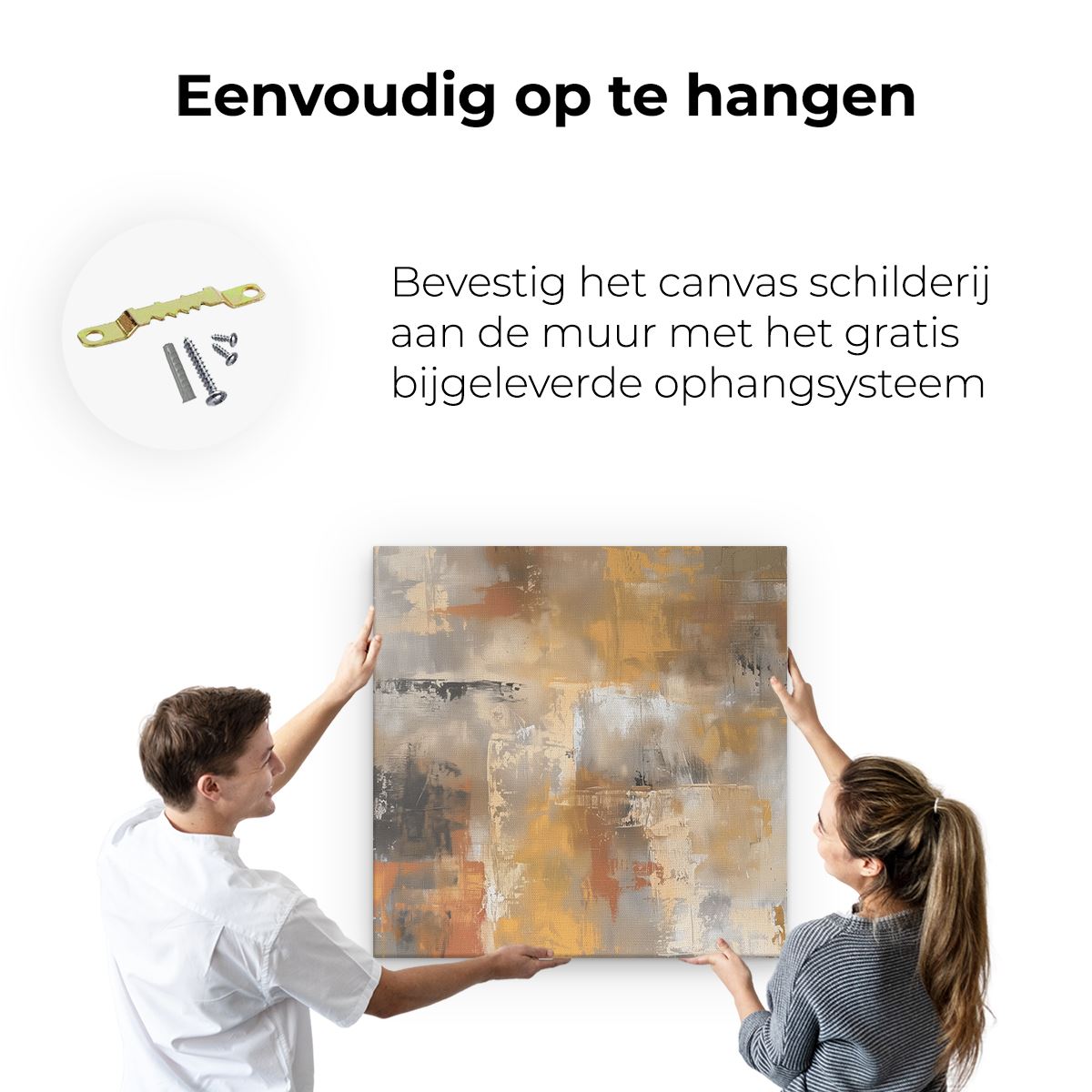 Bij aankoop ontvang je een meegeleverd ophangsysteem, zodat je op een simpele en snelle wijze het schilderij boven de bank of bed kan monteren.