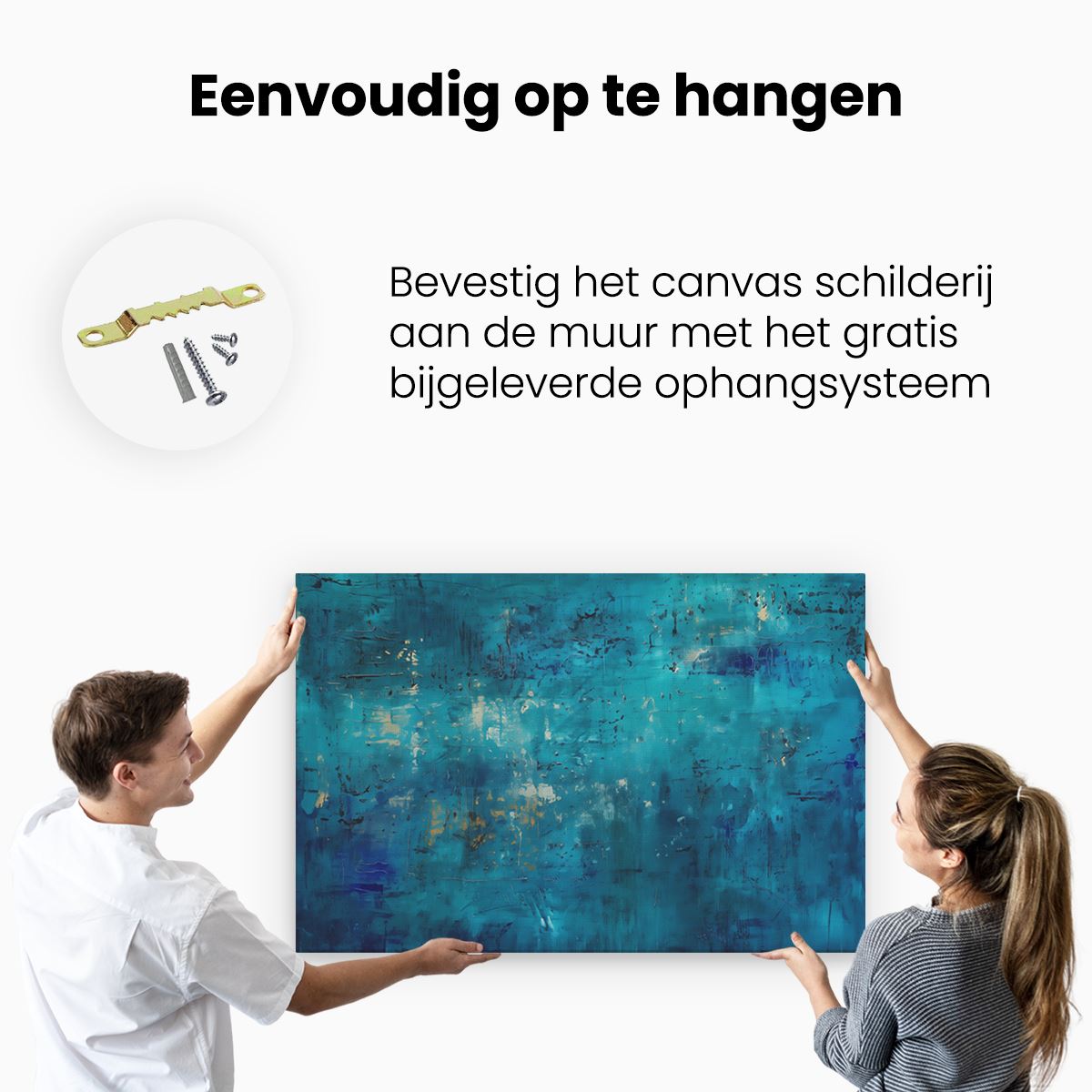 Bij aankoop ontvang je een meegeleverd ophangsysteem, zodat je op een simpele en snelle wijze het schilderij boven de bank of bed kan monteren.