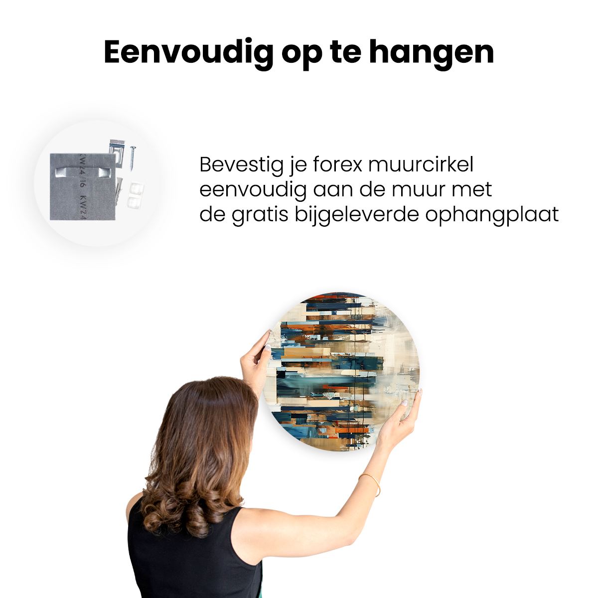 Gebruik het meegeleverde bevestigingsmateriaal om de wandcirkel aan de meeste wanden om te kunnen hangen. Een schroef en plug leveren we mee.
