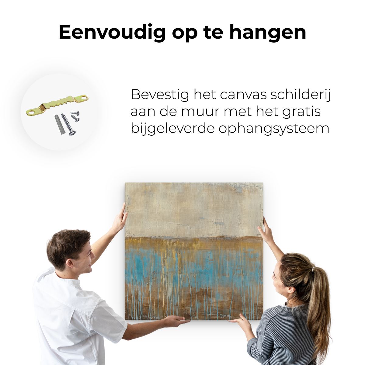 Bij aankoop ontvang je een meegeleverd ophangsysteem, zodat je op een simpele en snelle wijze het schilderij boven de bank of bed kan monteren.