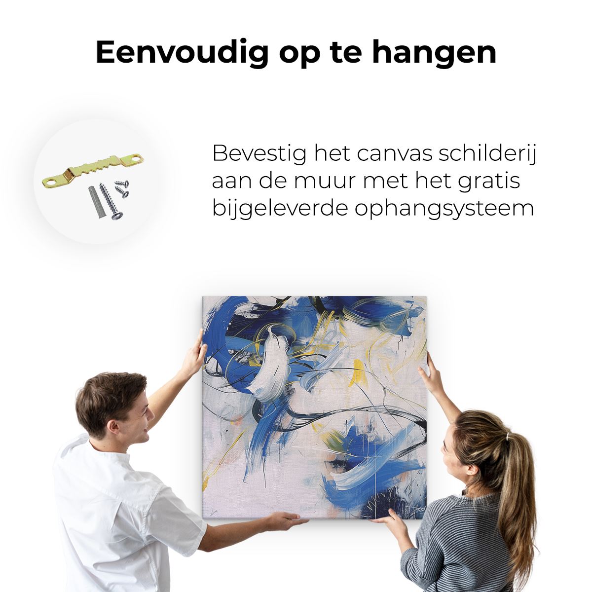 Bij aankoop ontvang je een meegeleverd ophangsysteem, zodat je op een simpele en snelle wijze het schilderij boven de bank of bed kan monteren.