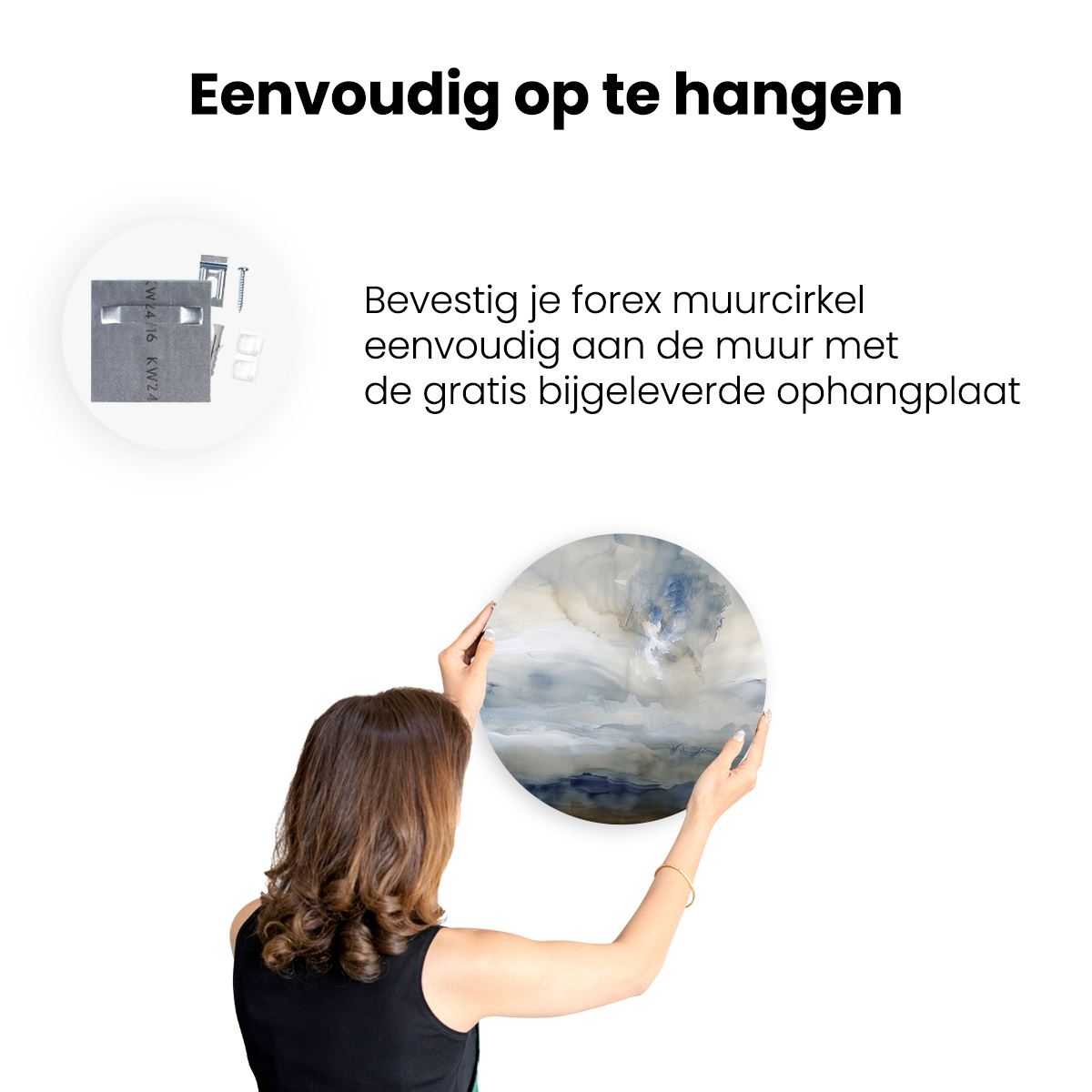 Gebruik het meegeleverde bevestigingsmateriaal om de wandcirkel aan de meeste wanden om te kunnen hangen. Een schroef en plug leveren we mee.