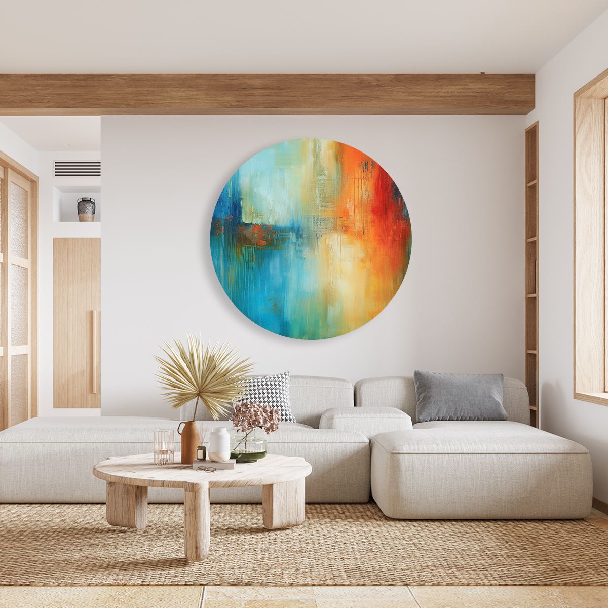 Wandcirkel Abstract Kunstwerk met Blauwe, Oranje en Rode Kleuren