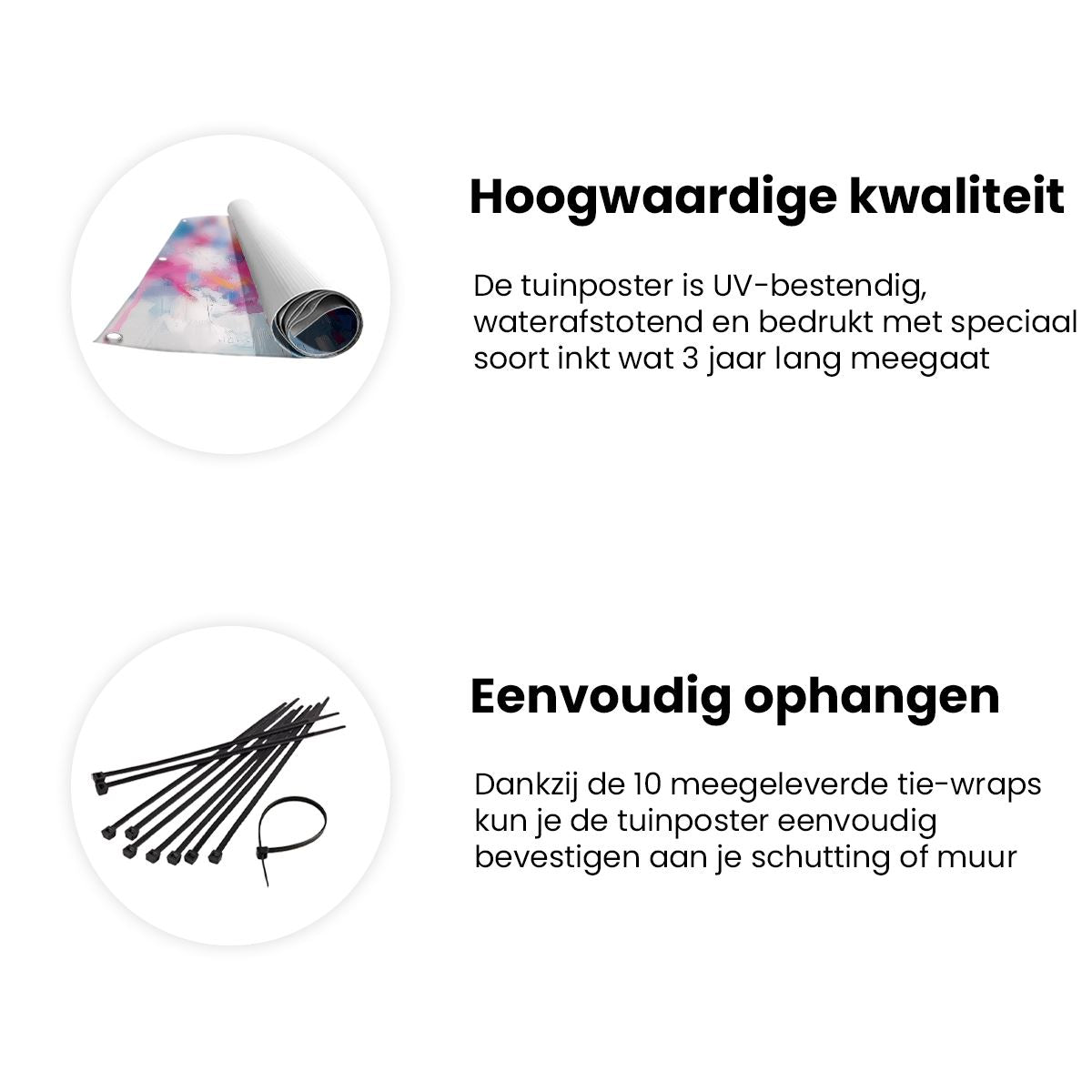 Bij aankoop ontvang je een meegeleverd ophangsysteem, zodat je op een simpele en snelle wijze de tuinposter kan ophangen.