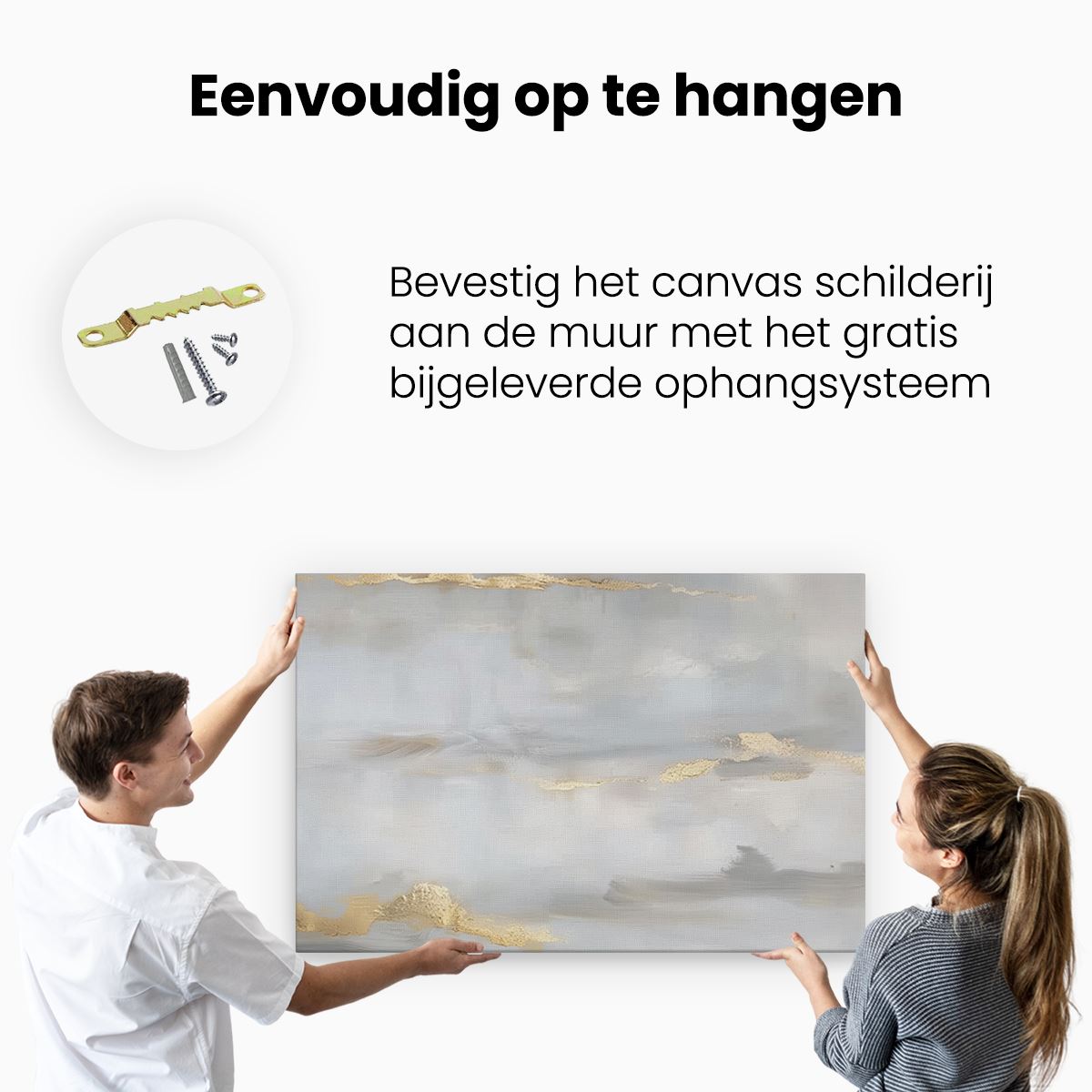 Bij aankoop ontvang je een meegeleverd ophangsysteem, zodat je op een simpele en snelle wijze het schilderij boven de bank of bed kan monteren.