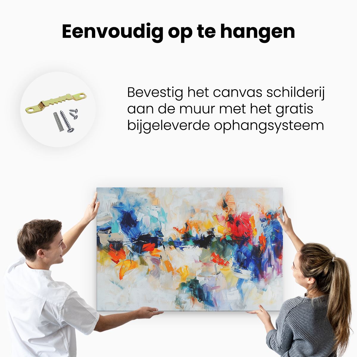 Bij aankoop ontvang je een meegeleverd ophangsysteem, zodat je op een simpele en snelle wijze het schilderij boven de bank of bed kan monteren.