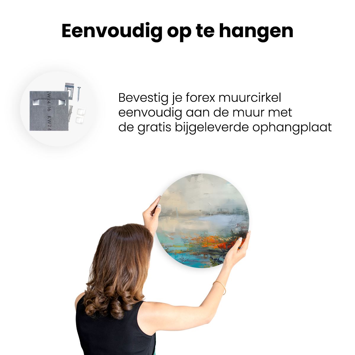 Gebruik het meegeleverde bevestigingsmateriaal om de wandcirkel aan de meeste wanden om te kunnen hangen. Een schroef en plug leveren we mee.