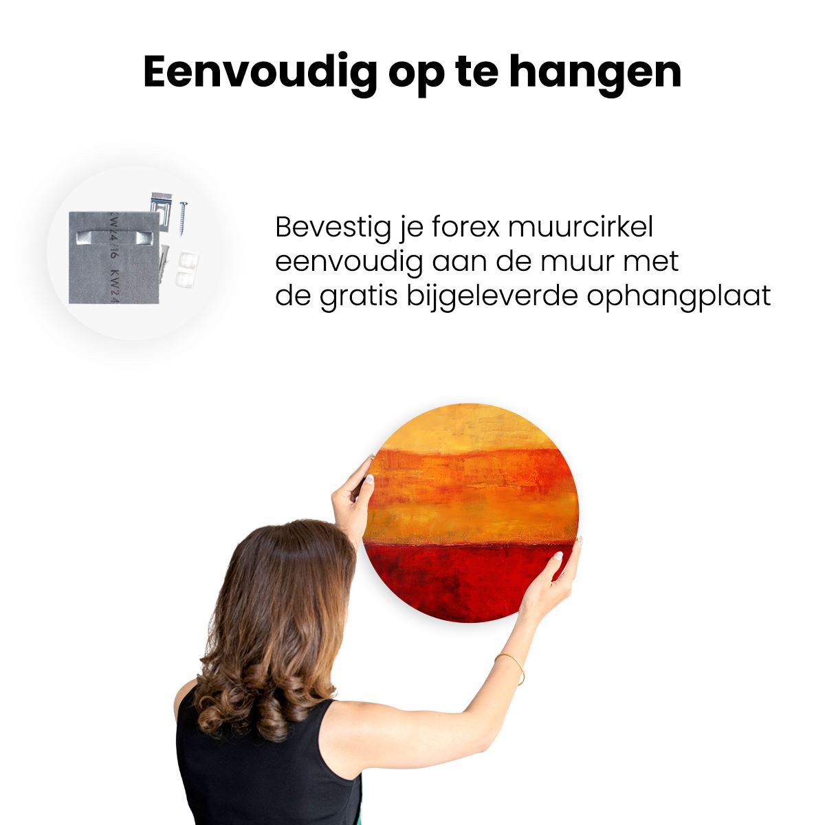 Gebruik het meegeleverde bevestigingsmateriaal om de wandcirkel aan de meeste wanden om te kunnen hangen. Een schroef en plug leveren we mee.