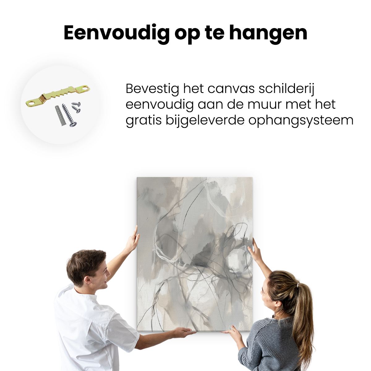 Bij aankoop ontvang je een meegeleverd ophangsysteem, zodat je op een simpele en snelle wijze het schilderij boven de bank of bed kan monteren.