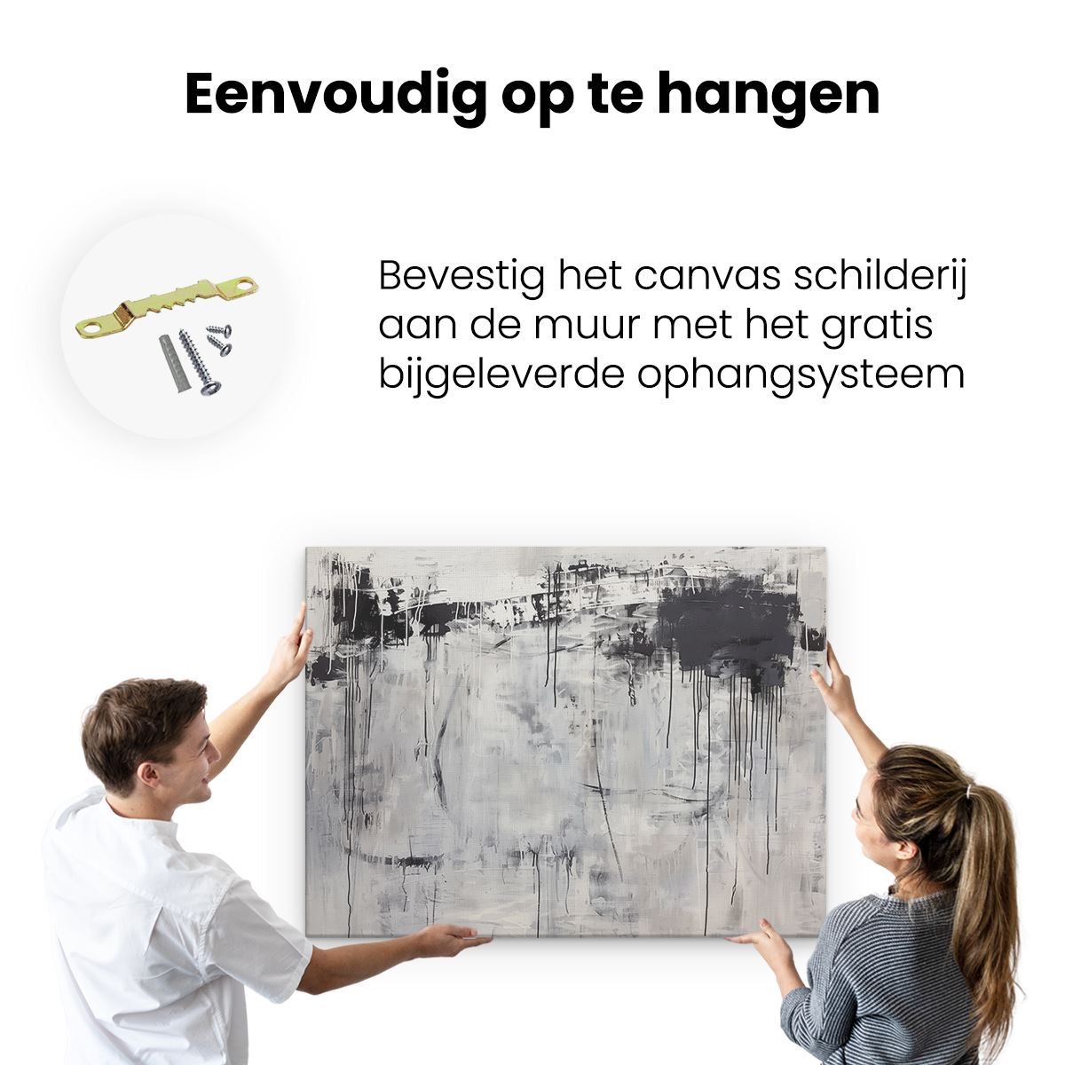 Bij aankoop ontvang je een meegeleverd ophangsysteem, zodat je op een simpele en snelle wijze het schilderij boven de bank of bed kan monteren.