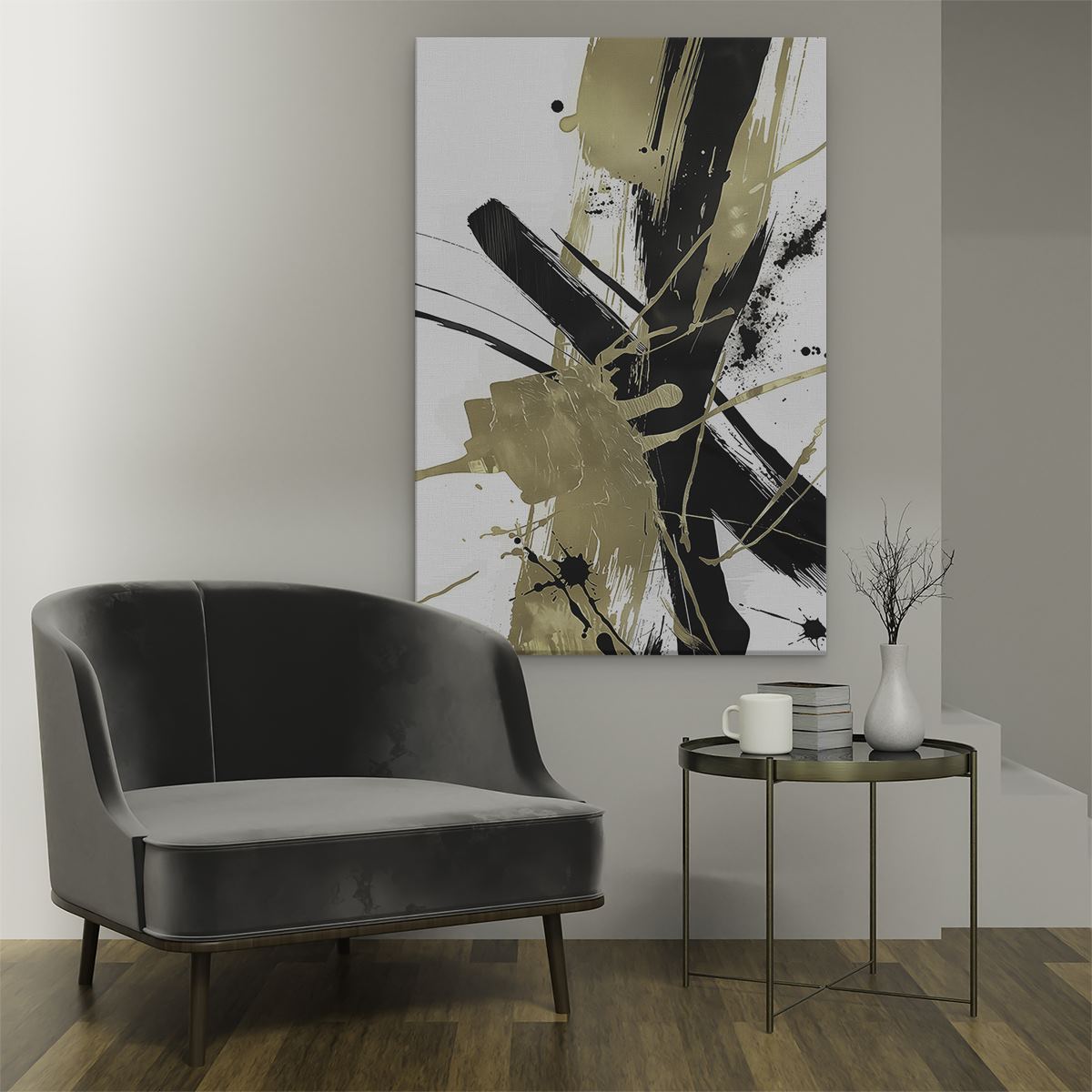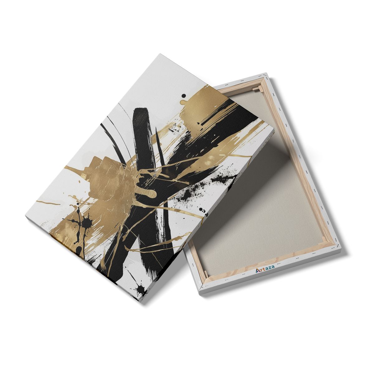 Schilderij Abstract Kunstwerk met Zwarte en Gouden Verfspatten