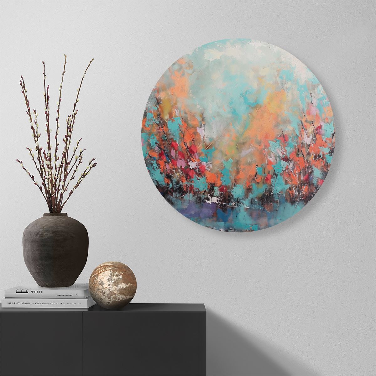 Wandcirkel Abstract Kunstwerk van Bomen in Blauw en Oranje