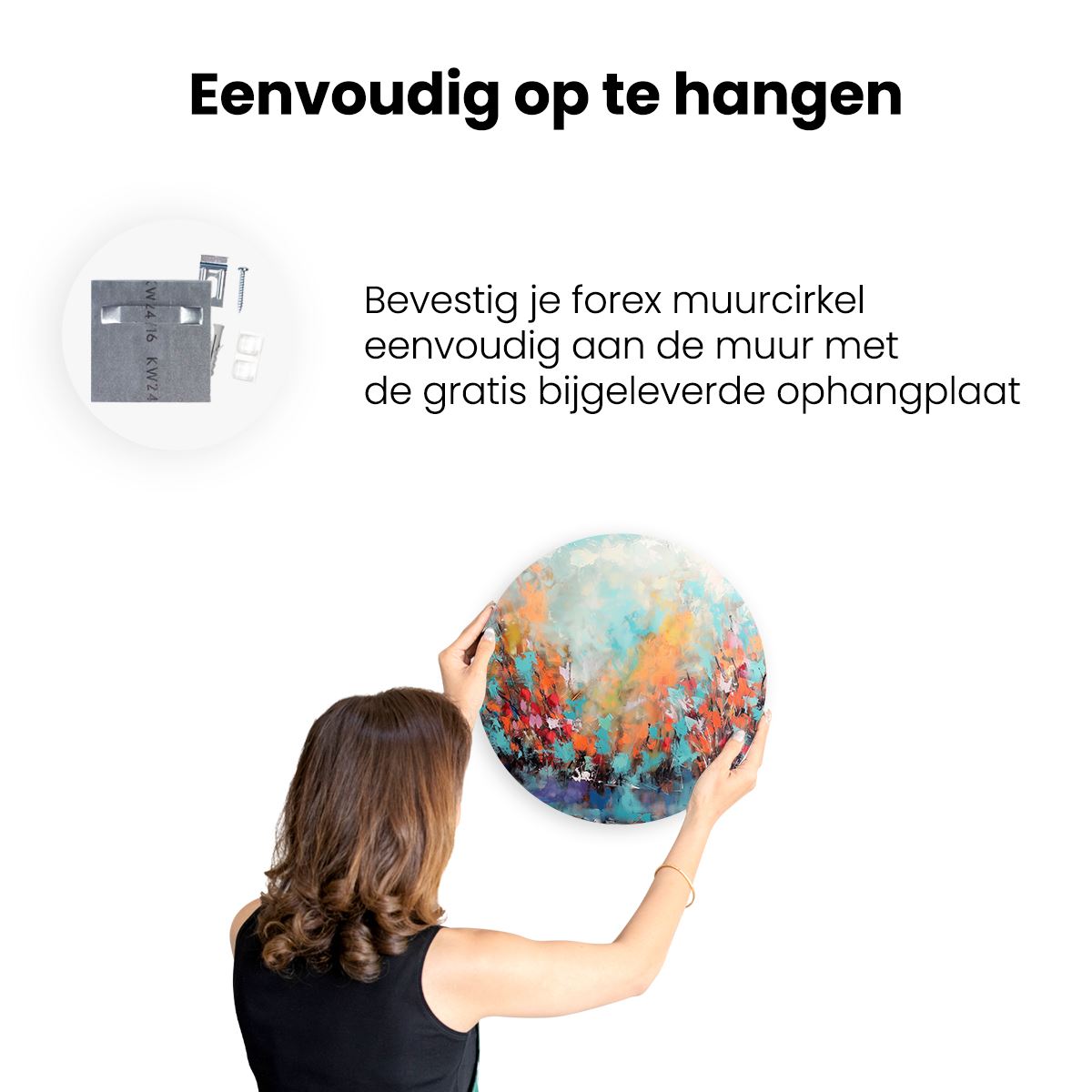 Gebruik het meegeleverde bevestigingsmateriaal om de wandcirkel aan de meeste wanden om te kunnen hangen. Een schroef en plug leveren we mee.