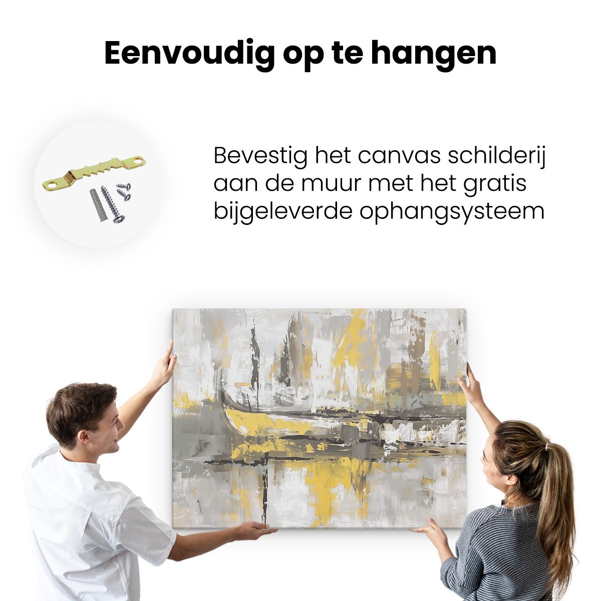Bij aankoop ontvang je een meegeleverd ophangsysteem, zodat je op een simpele en snelle wijze het schilderij boven de bank of bed kan monteren.