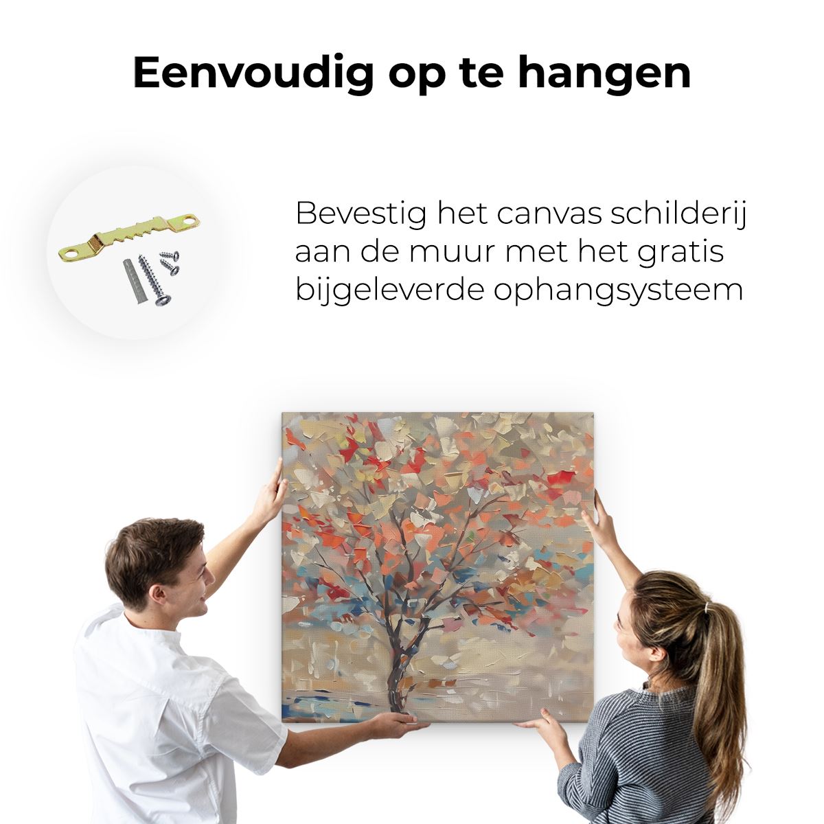 Bij aankoop ontvang je een meegeleverd ophangsysteem, zodat je op een simpele en snelle wijze het schilderij boven de bank of bed kan monteren.