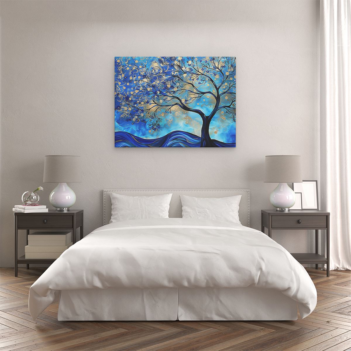 Bij aankoop ontvang je een meegeleverd ophangsysteem, zodat je op een simpele en snelle wijze het schilderij boven de bank of bed kan monteren.