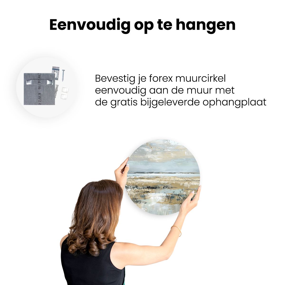 Gebruik het meegeleverde bevestigingsmateriaal om de wandcirkel aan de meeste wanden om te kunnen hangen. Een schroef en plug leveren we mee.