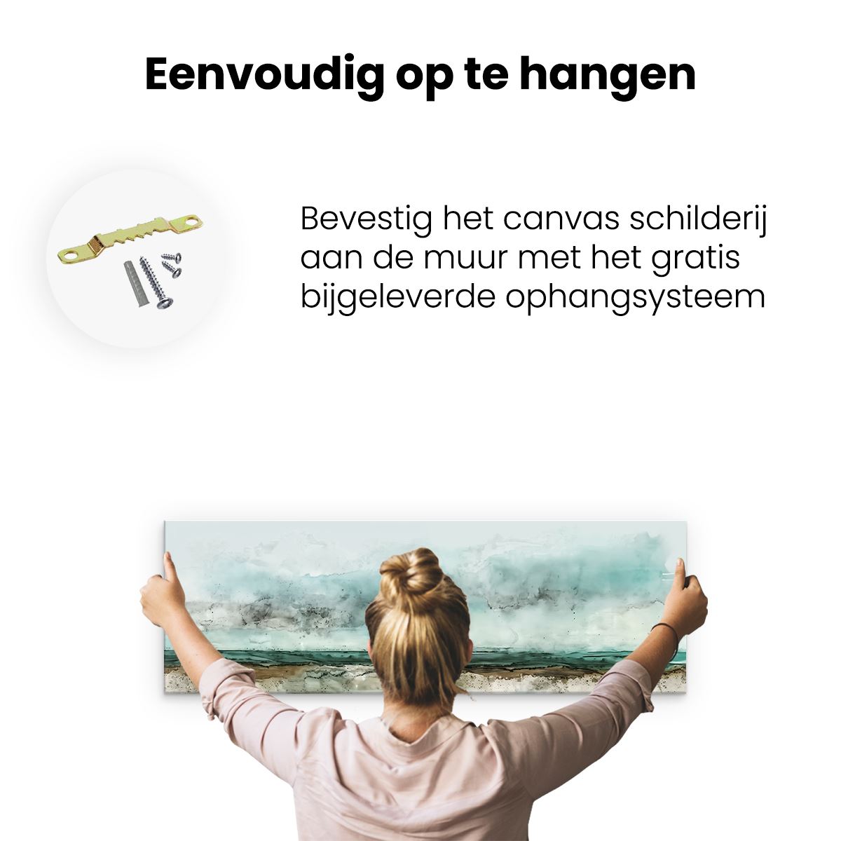 Bij aankoop ontvang je een meegeleverd ophangsysteem, zodat je op een simpele en snelle wijze het schilderij boven de bank of bed kan monteren.