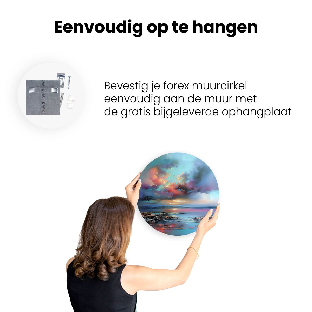 Gebruik het meegeleverde bevestigingsmateriaal om de wandcirkel aan de meeste wanden om te kunnen hangen. Een schroef en plug leveren we mee.
