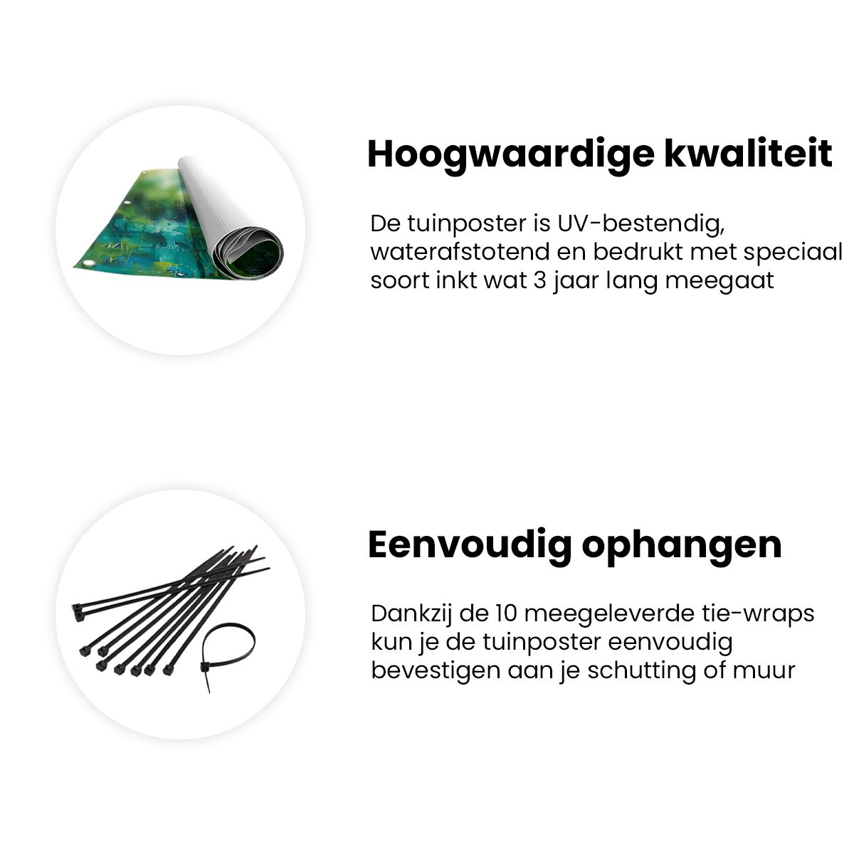 Bij aankoop ontvang je een meegeleverd ophangsysteem, zodat je op een simpele en snelle wijze de tuinposter kan ophangen.