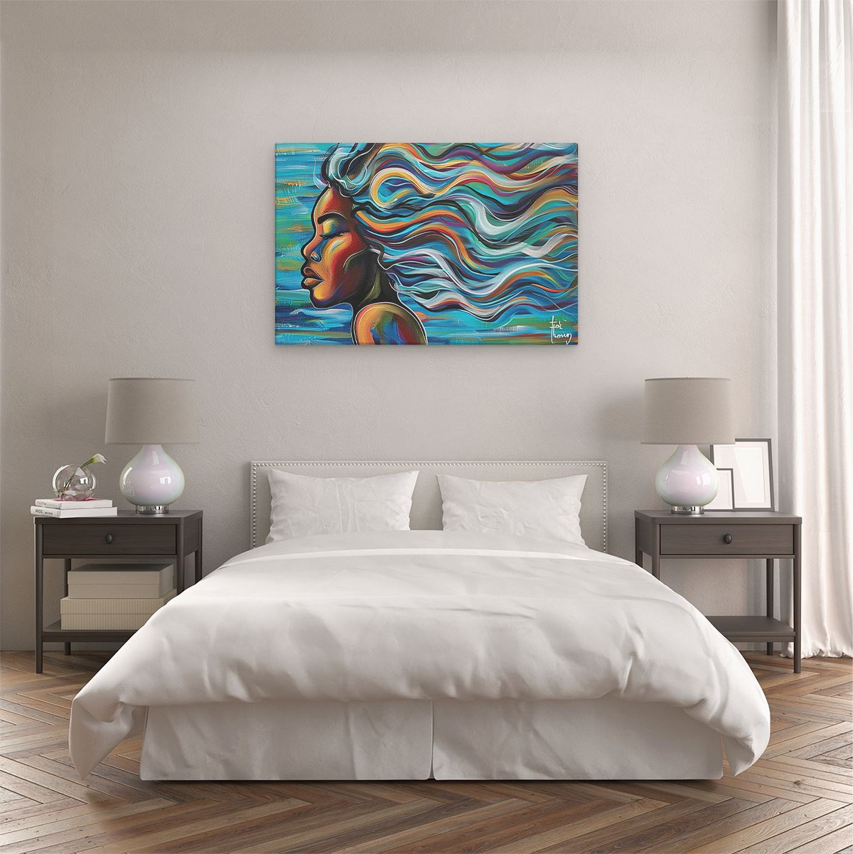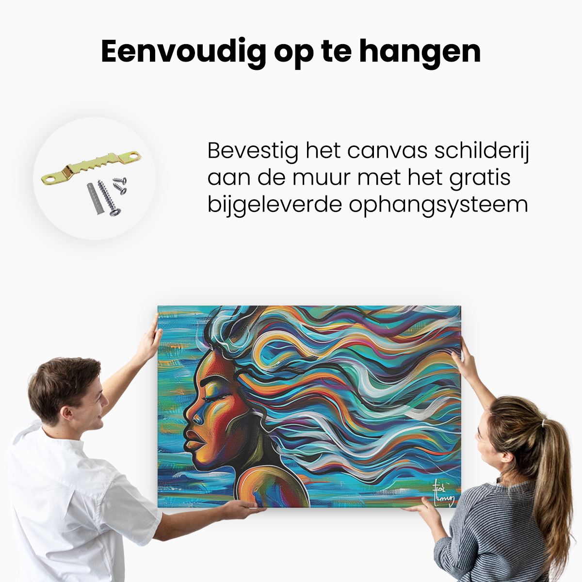 Bij aankoop ontvang je een meegeleverd ophangsysteem, zodat je op een simpele en snelle wijze het schilderij boven de bank of bed kan monteren.