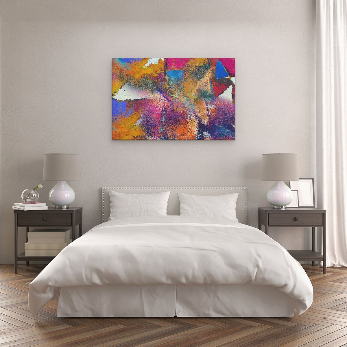 Bij aankoop ontvang je een meegeleverd ophangsysteem, zodat je op een simpele en snelle wijze het schilderij boven de bank of bed kan monteren.