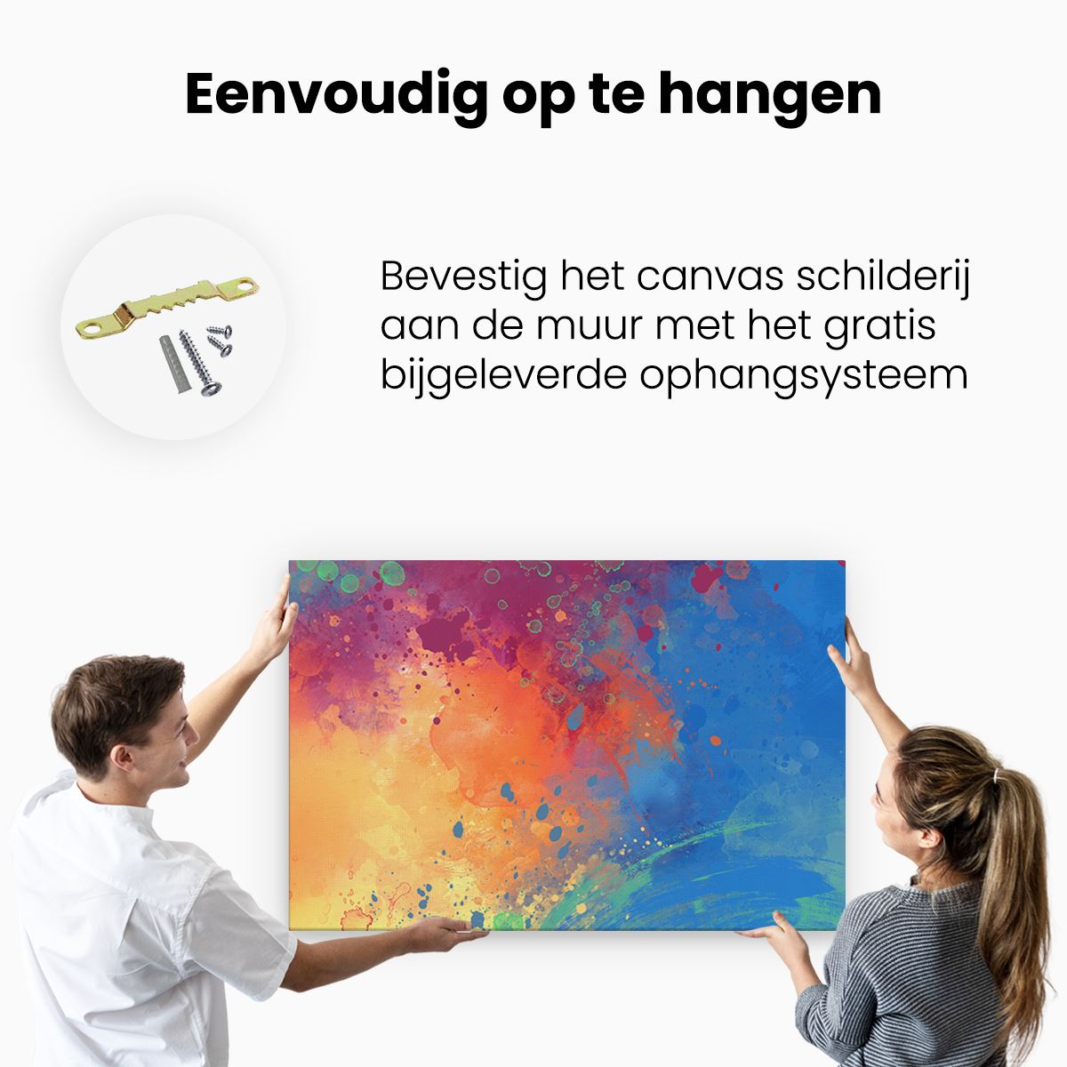 Bij aankoop ontvang je een meegeleverd ophangsysteem, zodat je op een simpele en snelle wijze het schilderij boven de bank of bed kan monteren.
