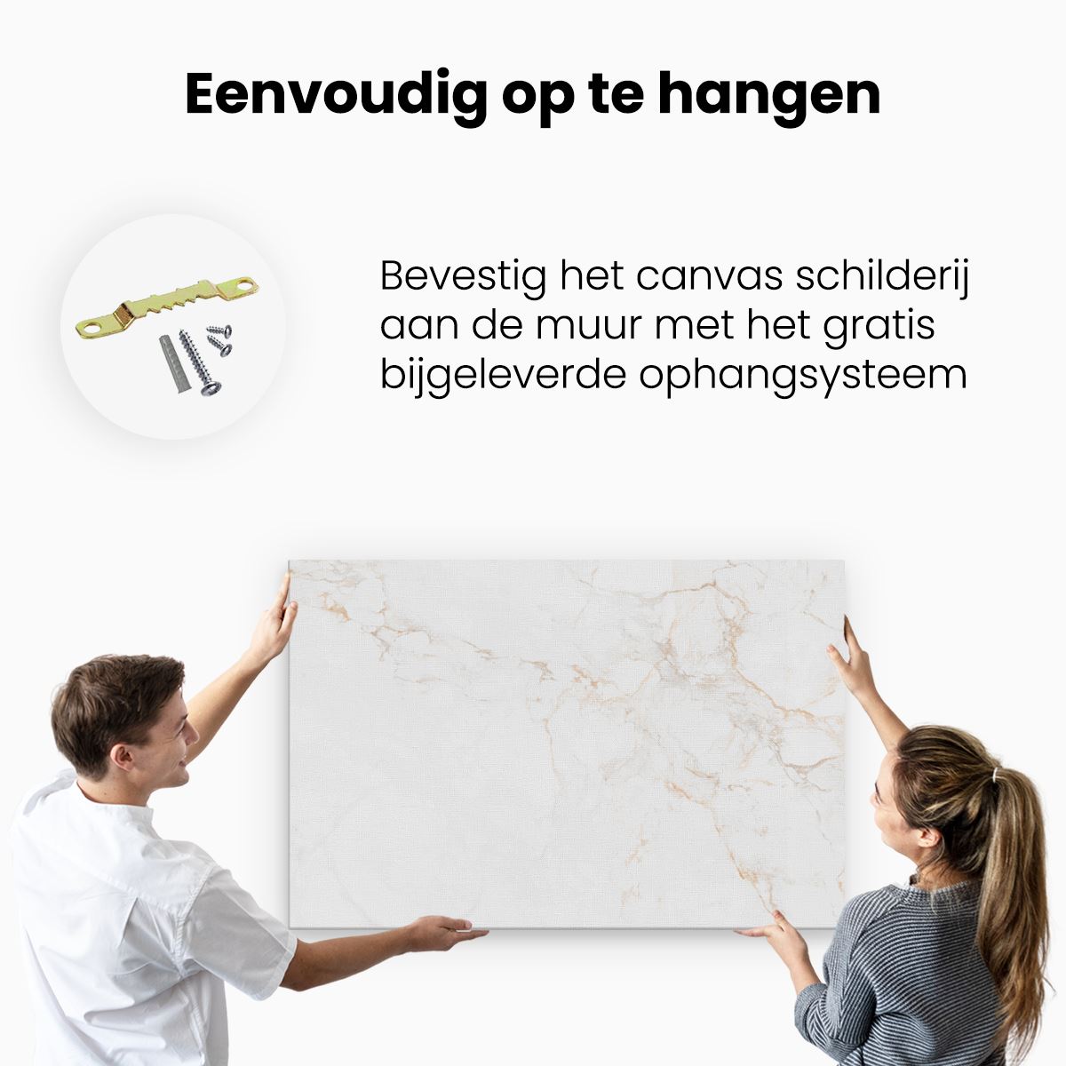 Bij aankoop ontvang je een meegeleverd ophangsysteem, zodat je op een simpele en snelle wijze het schilderij boven de bank of bed kan monteren.