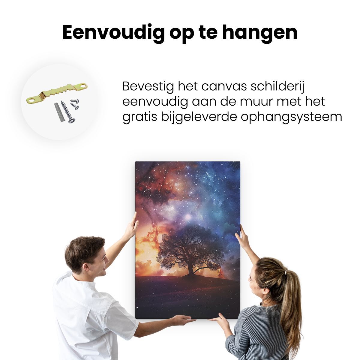 Bij aankoop ontvang je een meegeleverd ophangsysteem, zodat je op een simpele en snelle wijze het schilderij boven de bank of bed kan monteren.