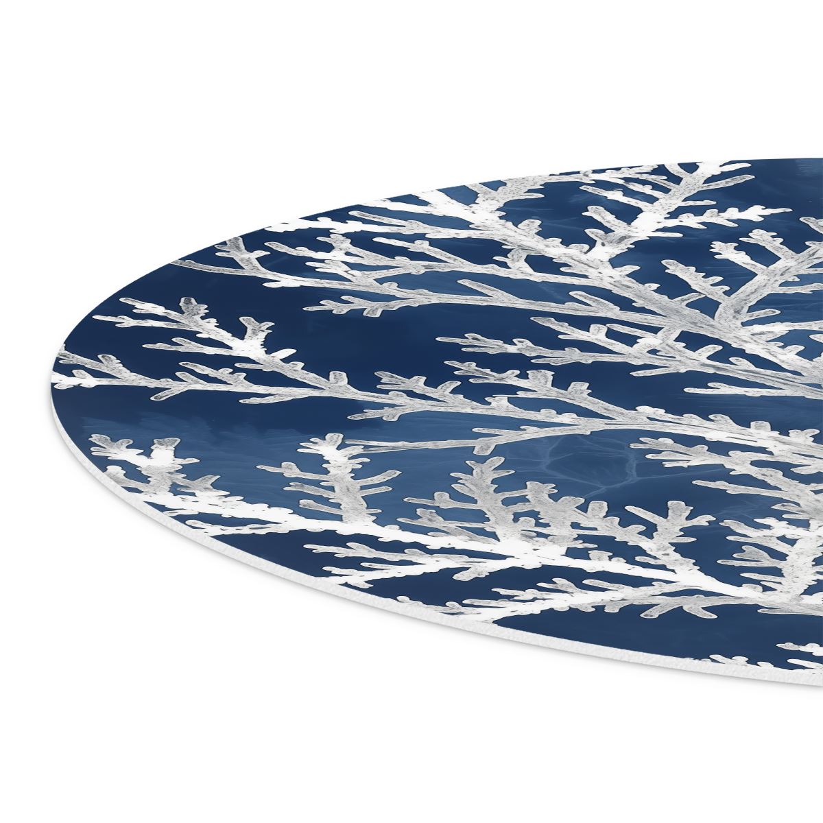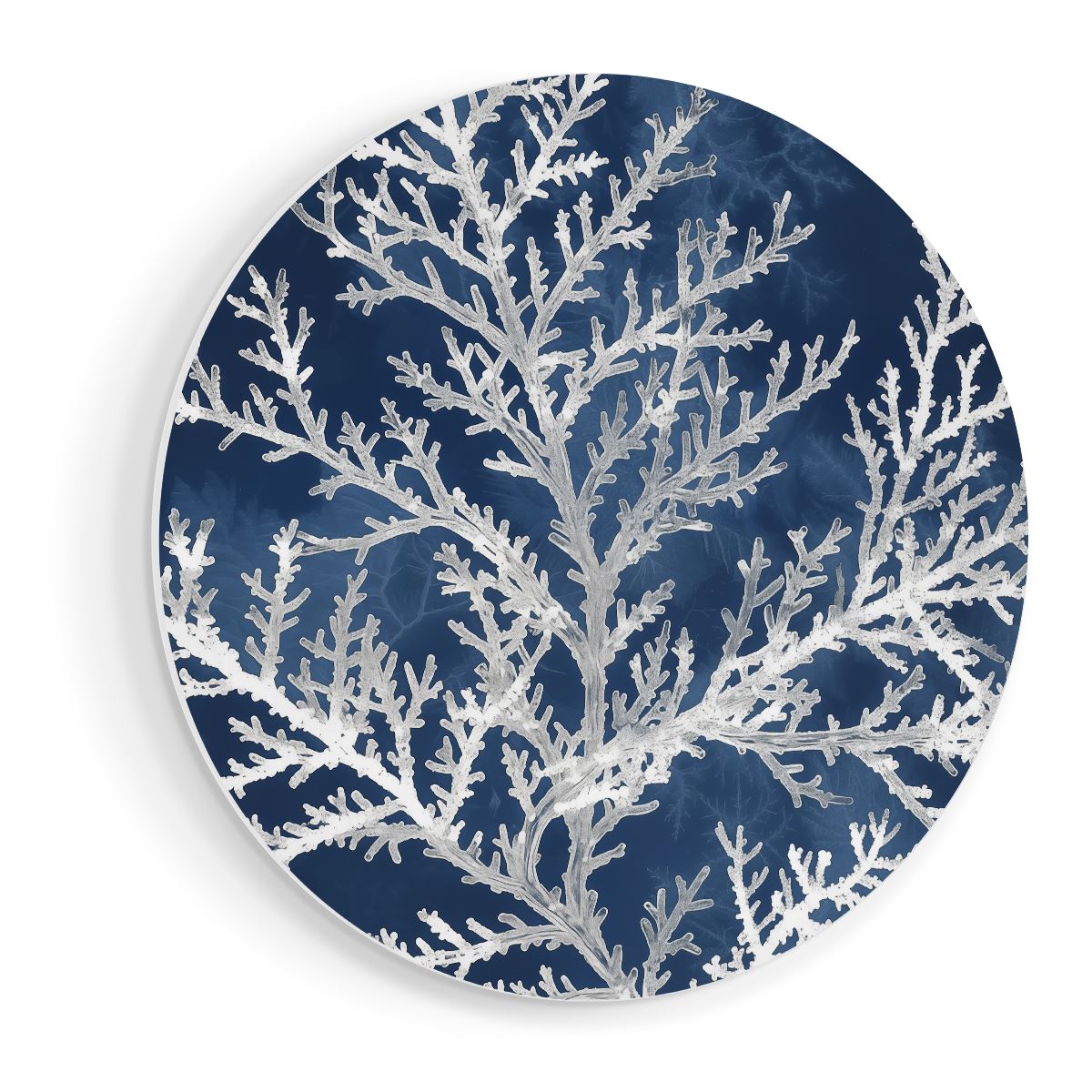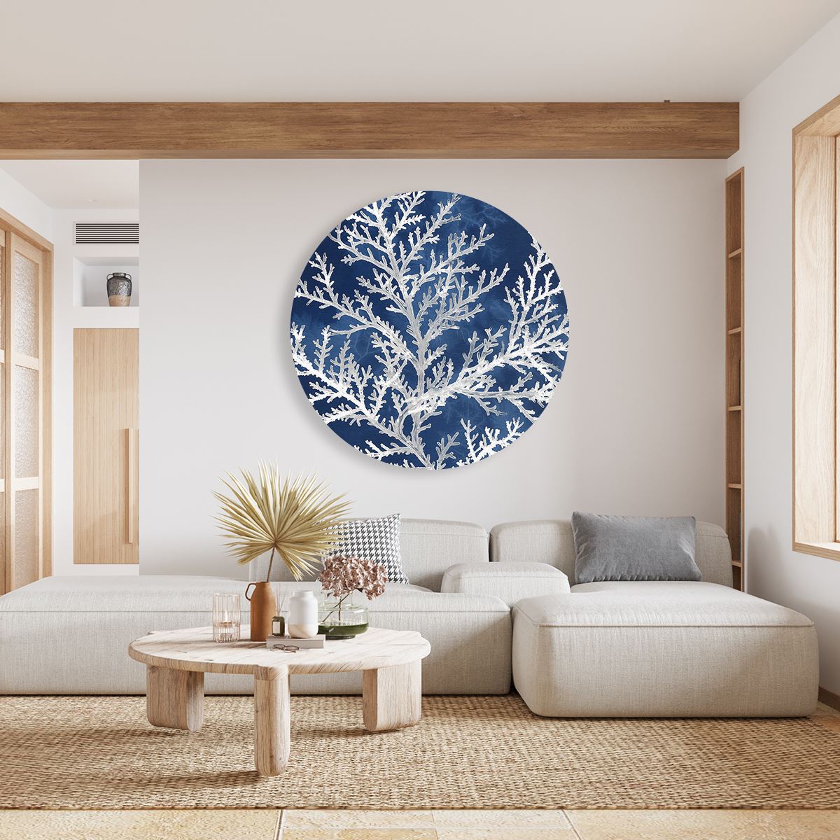 Wandcirkel Afbeelding van een Boom met Witte Takken op een Blauwe Achtergrond