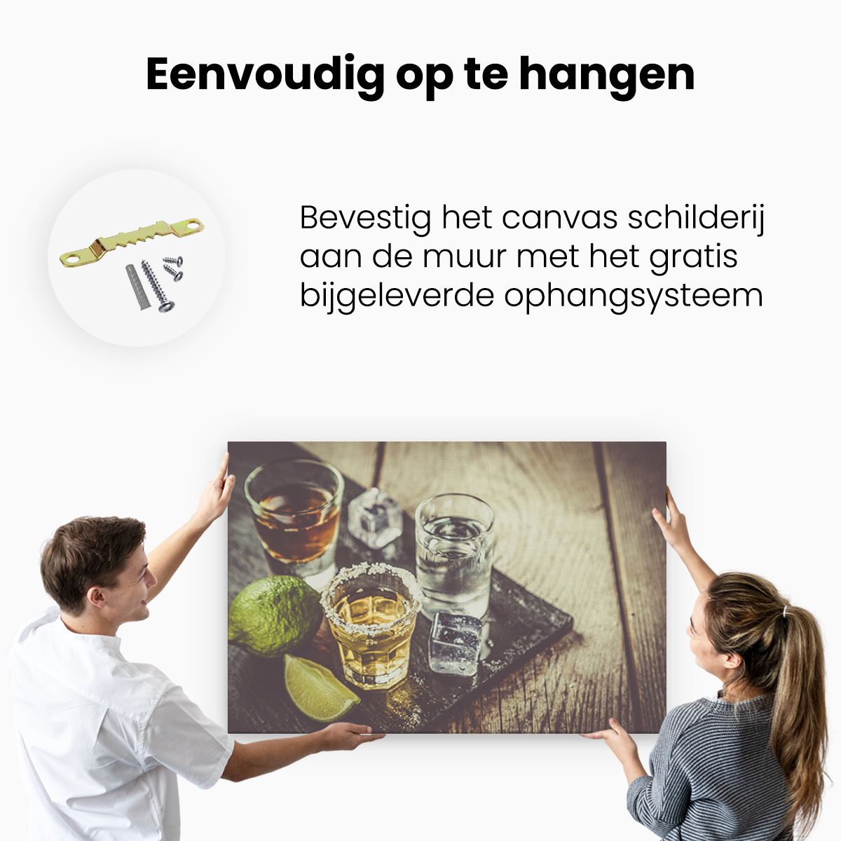 Bij aankoop ontvang je een meegeleverd ophangsysteem, zodat je op een simpele en snelle wijze het schilderij boven de bank of bed kan monteren.