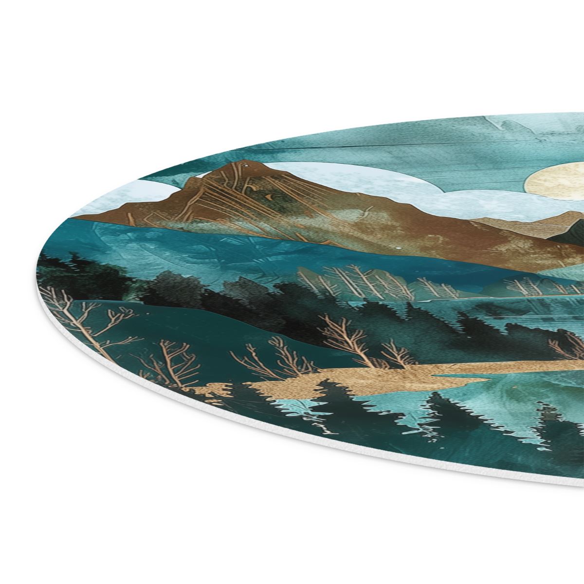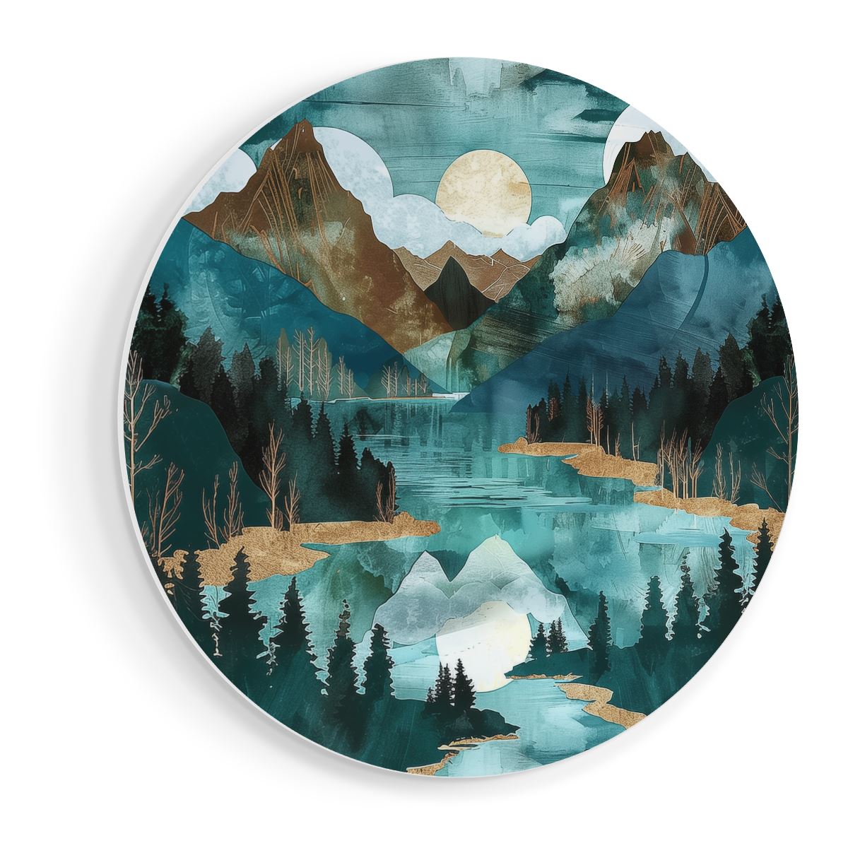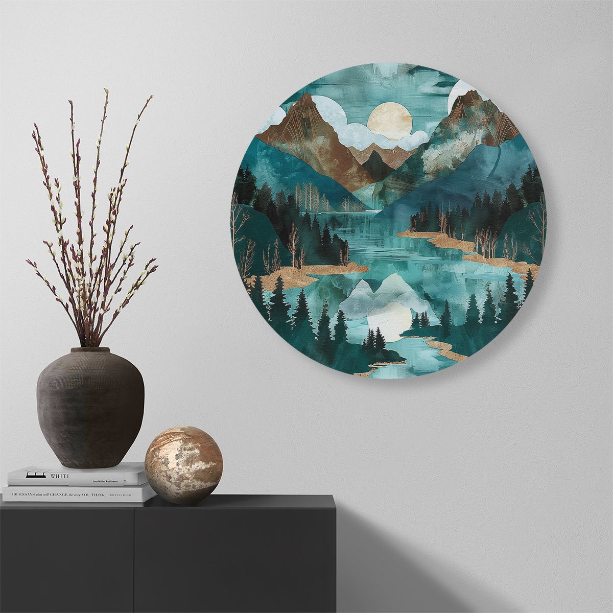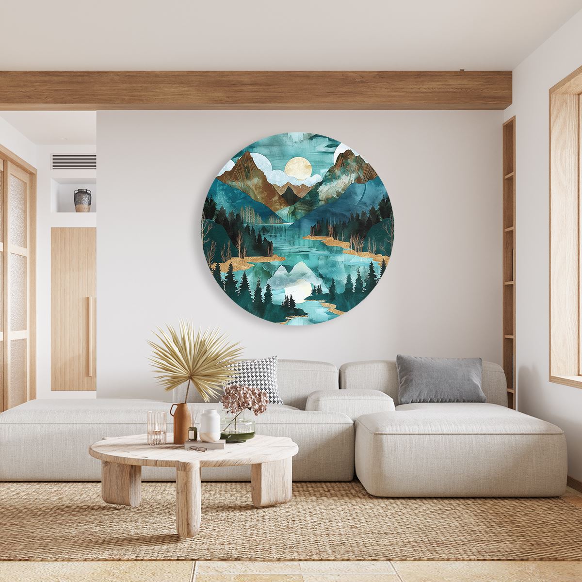 Wandcirkel Aquarelkunstwerk van Bergen en een Meer