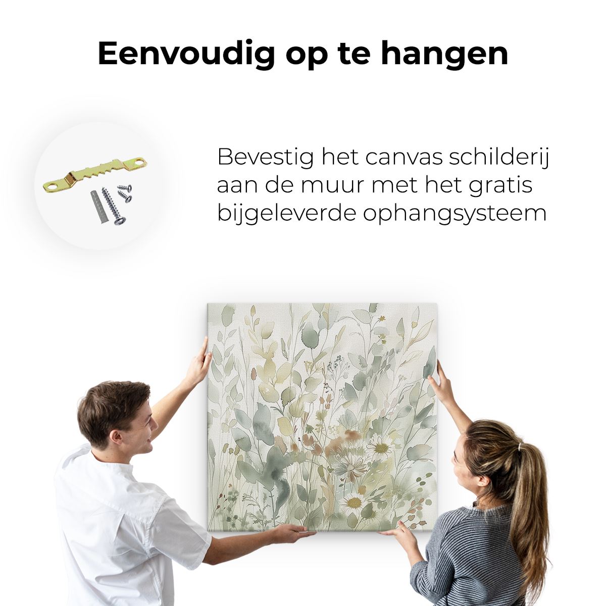 Bij aankoop ontvang je een meegeleverd ophangsysteem, zodat je op een simpele en snelle wijze het schilderij boven de bank of bed kan monteren.