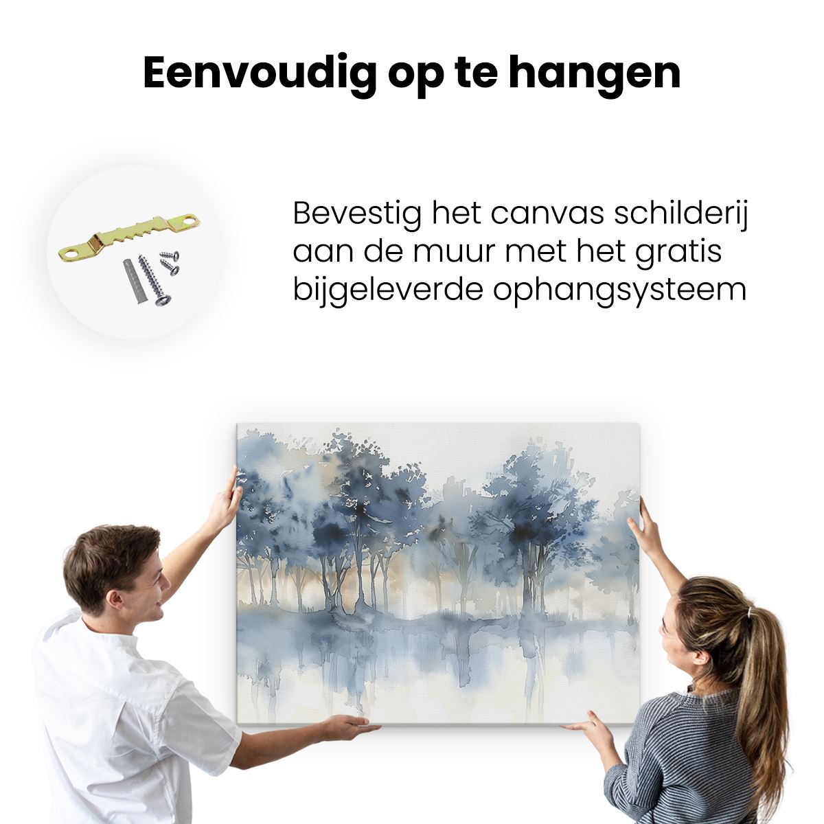 Bij aankoop ontvang je een meegeleverd ophangsysteem, zodat je op een simpele en snelle wijze het schilderij boven de bank of bed kan monteren.