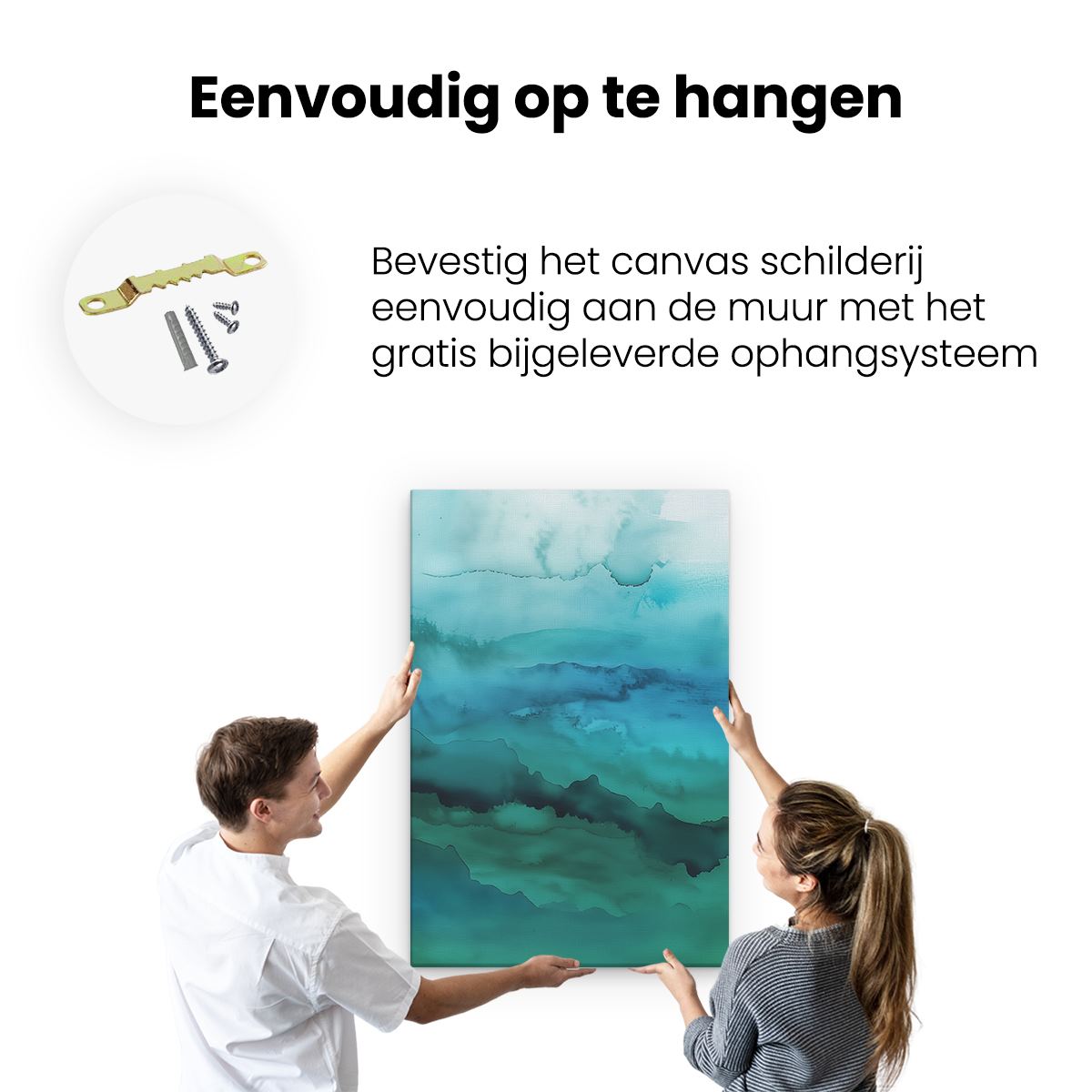 Bij aankoop ontvang je een meegeleverd ophangsysteem, zodat je op een simpele en snelle wijze het schilderij boven de bank of bed kan monteren.