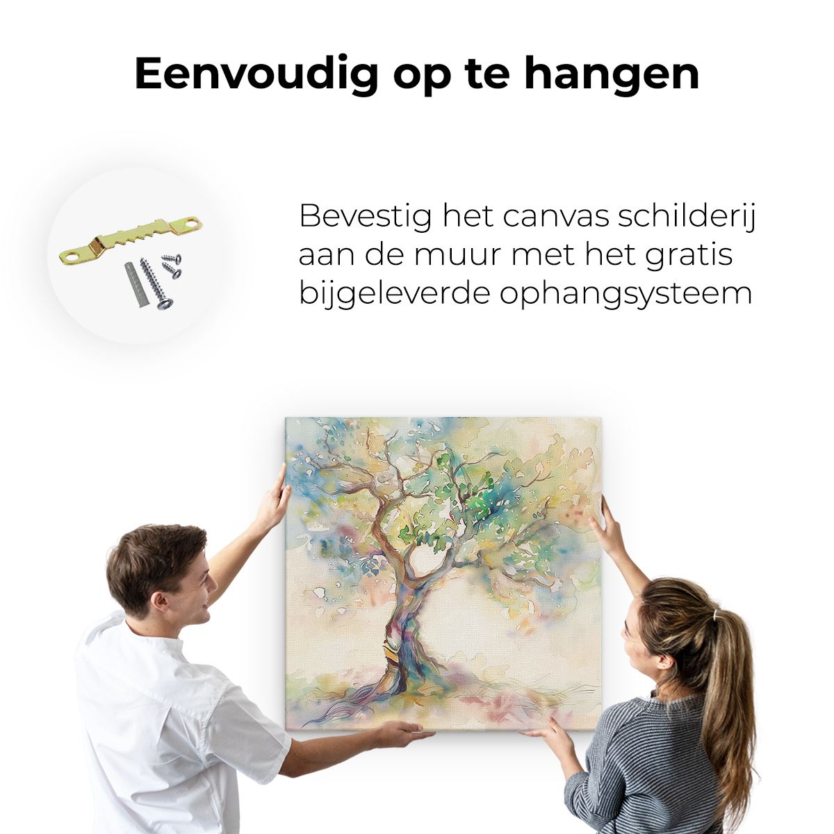 Bij aankoop ontvang je een meegeleverd ophangsysteem, zodat je op een simpele en snelle wijze het schilderij boven de bank of bed kan monteren.