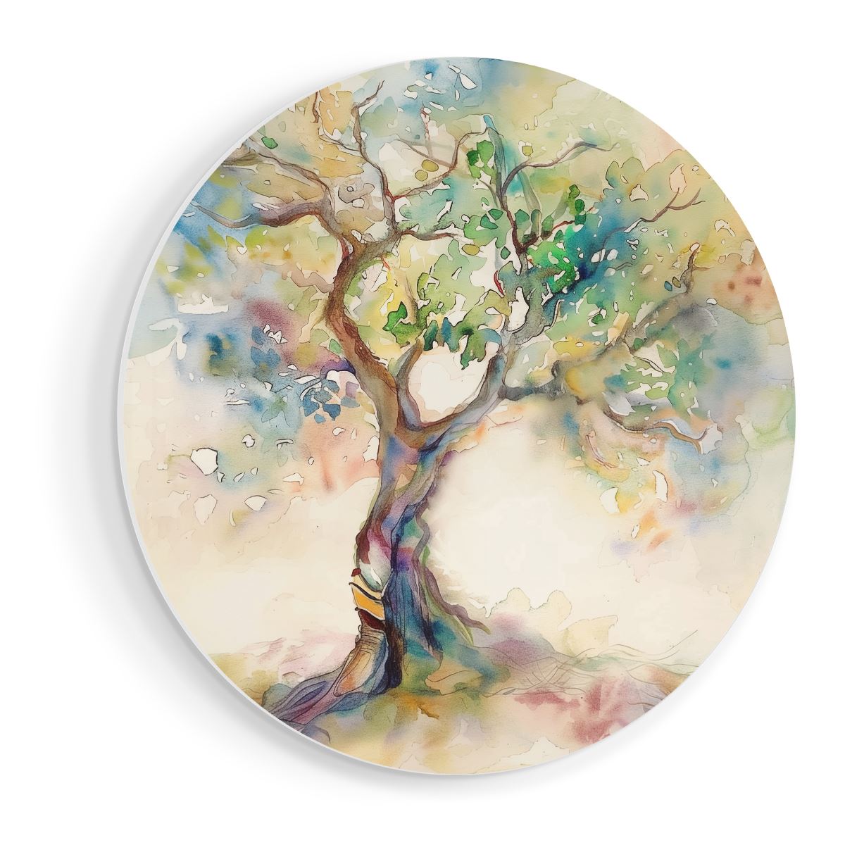Je kunt het beste de cirkel plat op de vloer leggen en vanuit daar bepalen wat recht is. Op het hoogste punt plak je verticaal een plakbandje, en dit laat je dan een stukje over de achterkant heen lopen. Dan draai je de wandcirkel om en plak je de ophangplaat op ¼ deel van de bovenkant, recht onder het plakbandje.