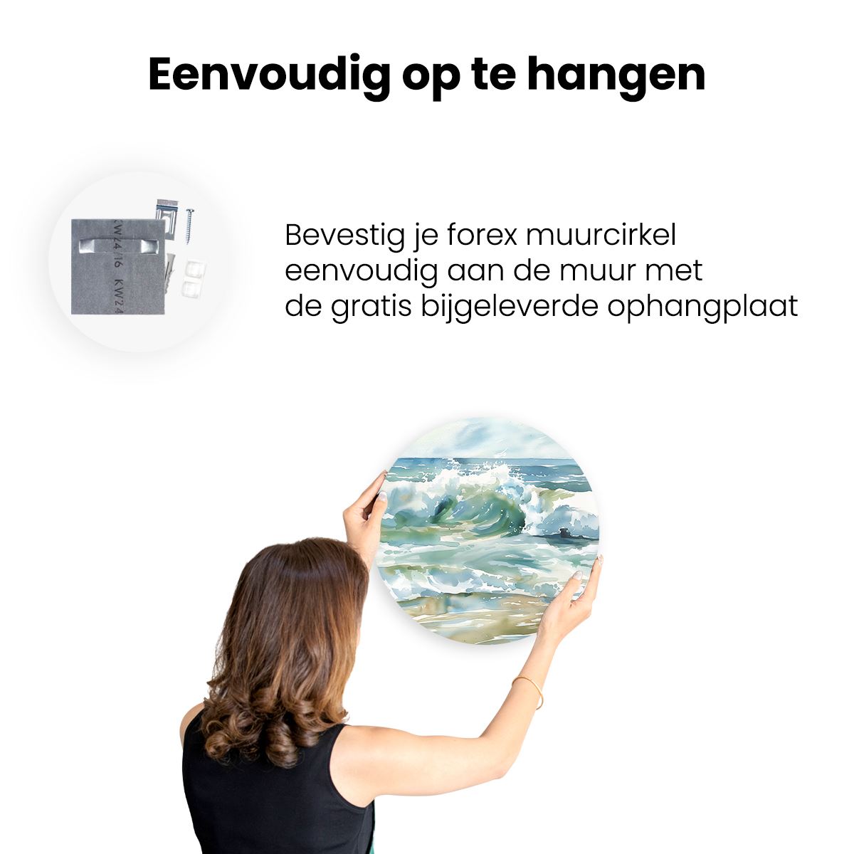 Gebruik het meegeleverde bevestigingsmateriaal om de wandcirkel aan de meeste wanden om te kunnen hangen. Een schroef en plug leveren we mee.