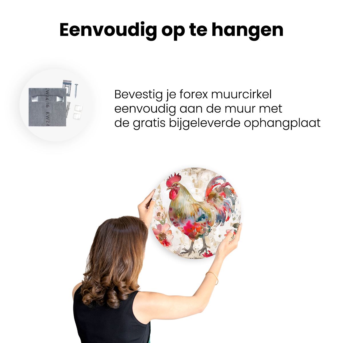 Wandcirkel Aquarelkunstwerk van een Haan met Bloemen