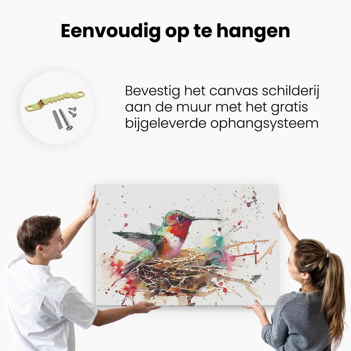 Bij aankoop ontvang je een meegeleverd ophangsysteem, zodat je op een simpele en snelle wijze het schilderij boven de bank of bed kan monteren.