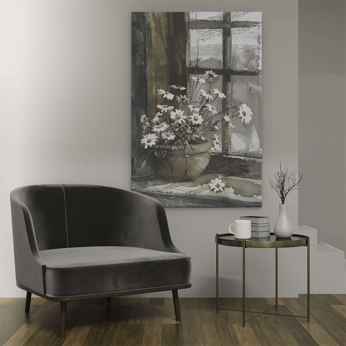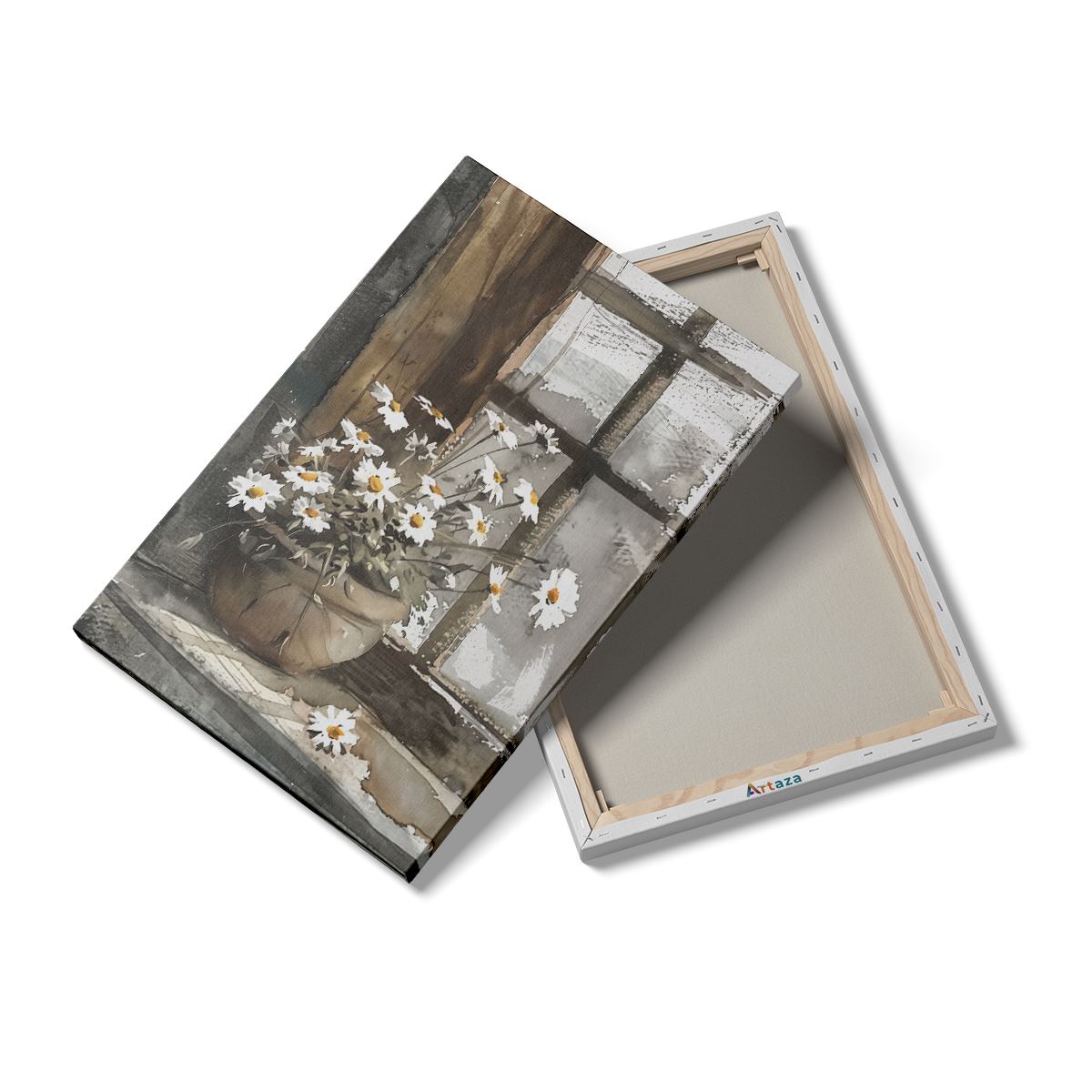 Schilderij Aquarelkunstwerk van Madeliefjes op een Vensterbank