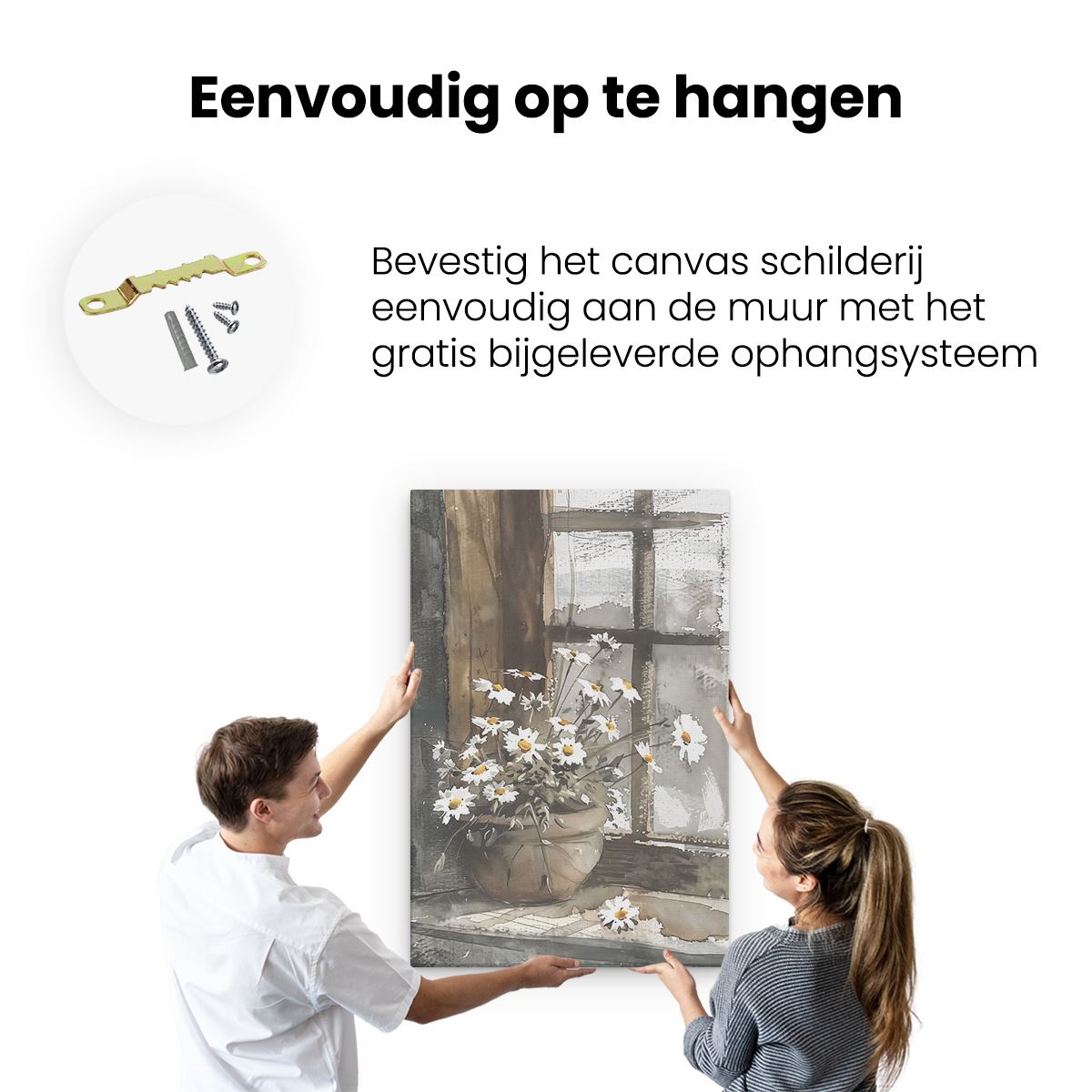 Bij aankoop ontvang je een meegeleverd ophangsysteem, zodat je op een simpele en snelle wijze het schilderij boven de bank of bed kan monteren.