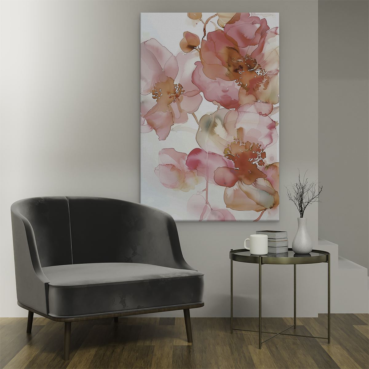 Schilderij Aquarelkunstwerk van Roze Bloemen op een Witte Achtergrond