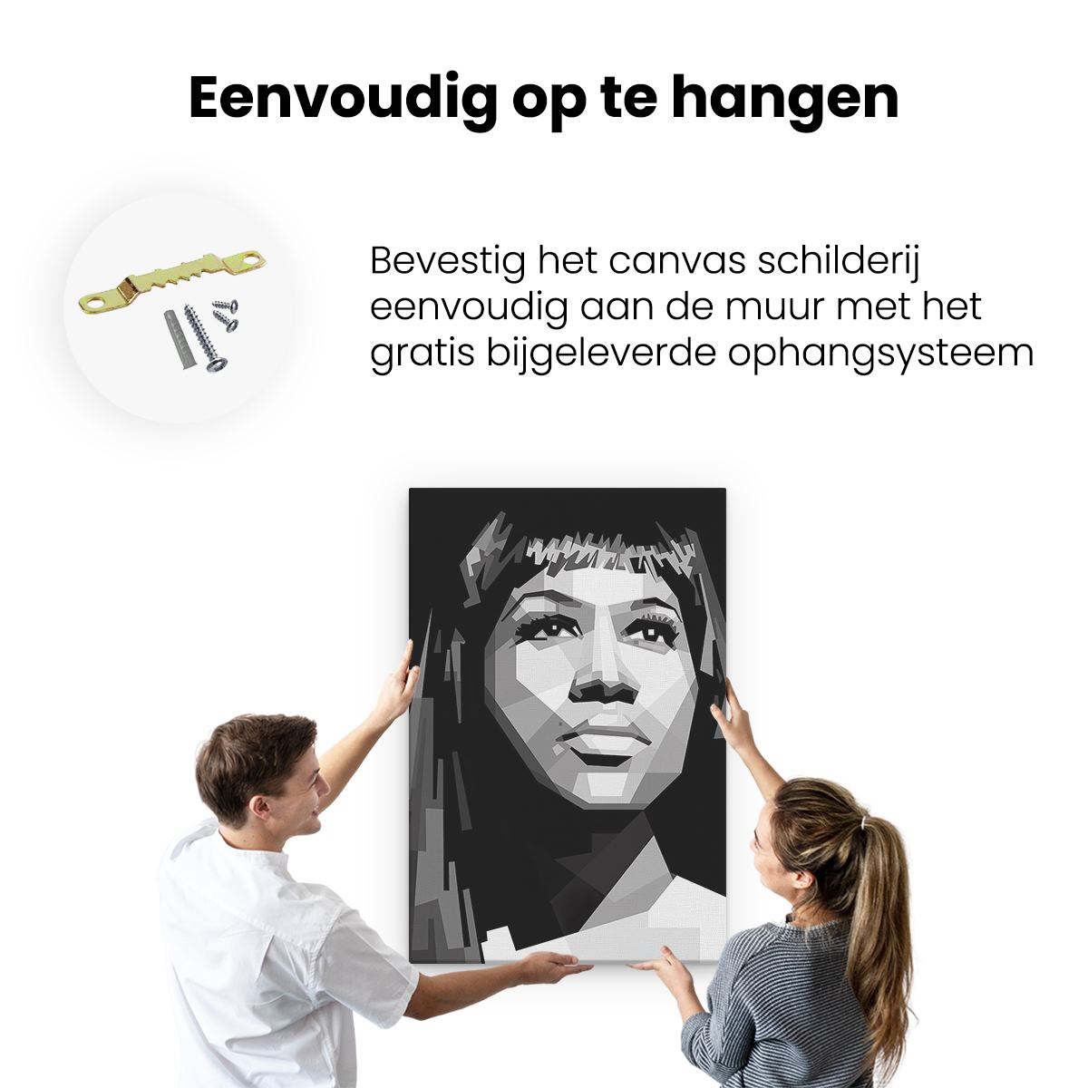 Bij aankoop ontvang je een meegeleverd ophangsysteem, zodat je op een simpele en snelle wijze het schilderij boven de bank of bed kan monteren.