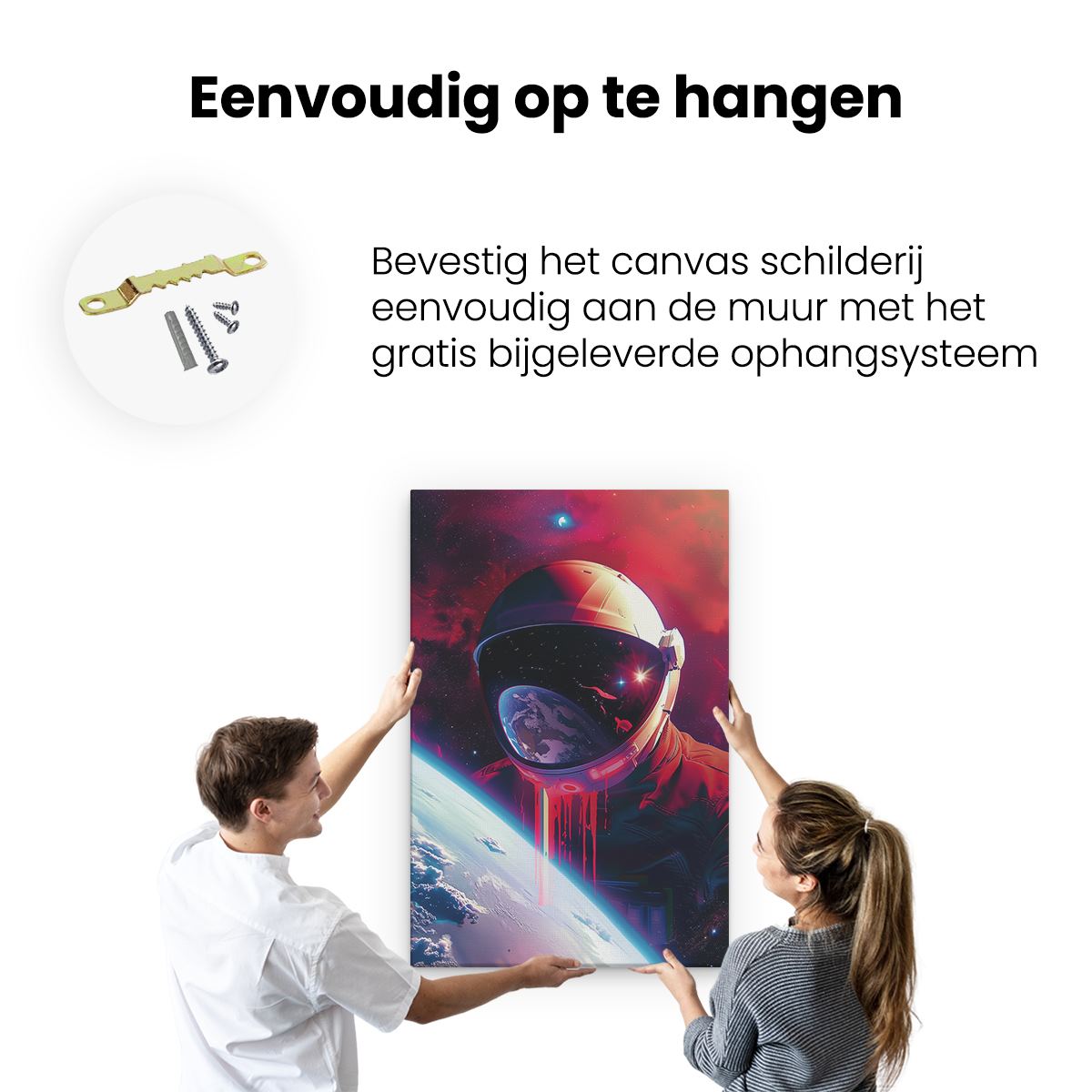 Bij aankoop ontvang je een meegeleverd ophangsysteem, zodat je op een simpele en snelle wijze het schilderij boven de bank of bed kan monteren.