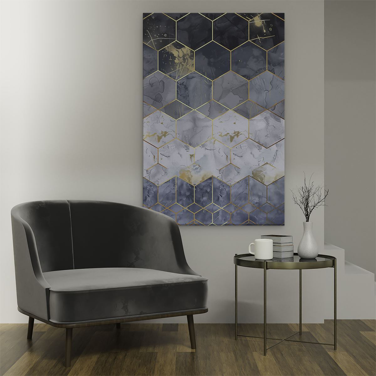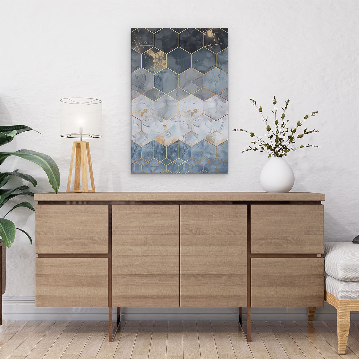 Schilderij Blauw en Goud Zeshoekig Patroon