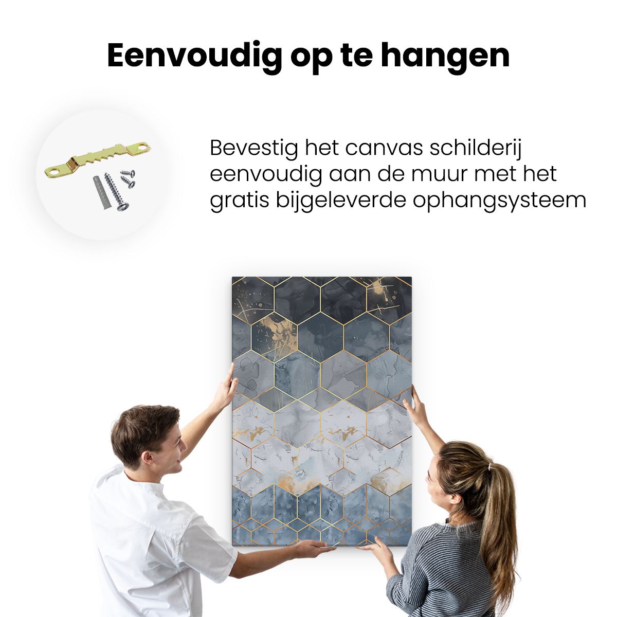 Bij aankoop ontvang je een meegeleverd ophangsysteem, zodat je op een simpele en snelle wijze het schilderij boven de bank of bed kan monteren.