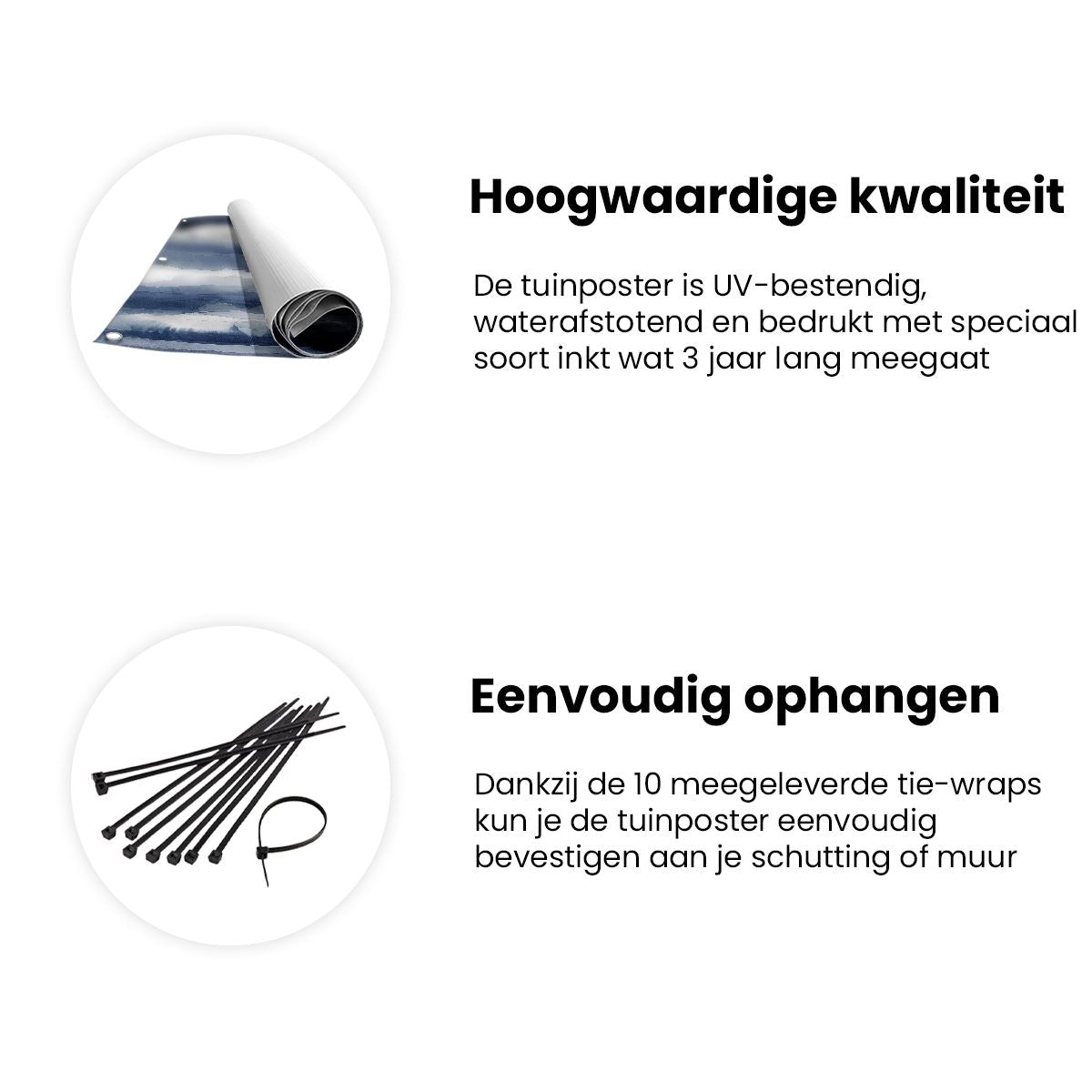 Bij aankoop ontvang je een meegeleverd ophangsysteem, zodat je op een simpele en snelle wijze de tuinposter kan ophangen.