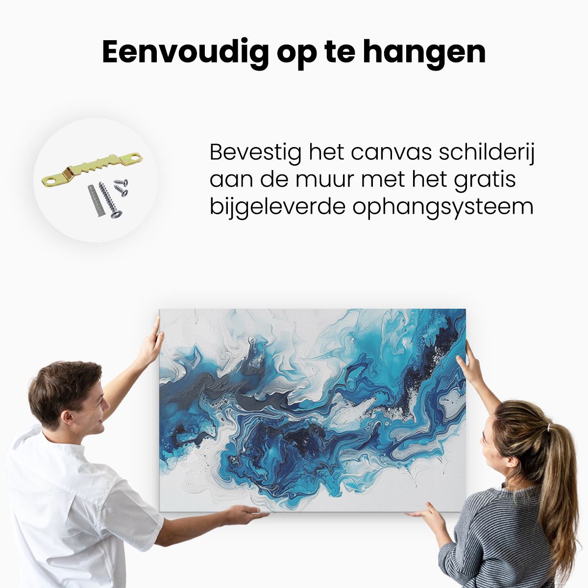 Bij aankoop ontvang je een meegeleverd ophangsysteem, zodat je op een simpele en snelle wijze het schilderij boven de bank of bed kan monteren.