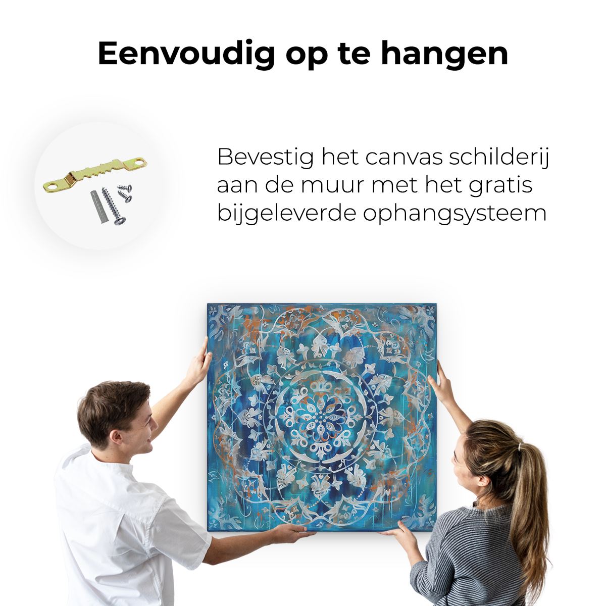 Bij aankoop ontvang je een meegeleverd ophangsysteem, zodat je op een simpele en snelle wijze het schilderij boven de bank of bed kan monteren.